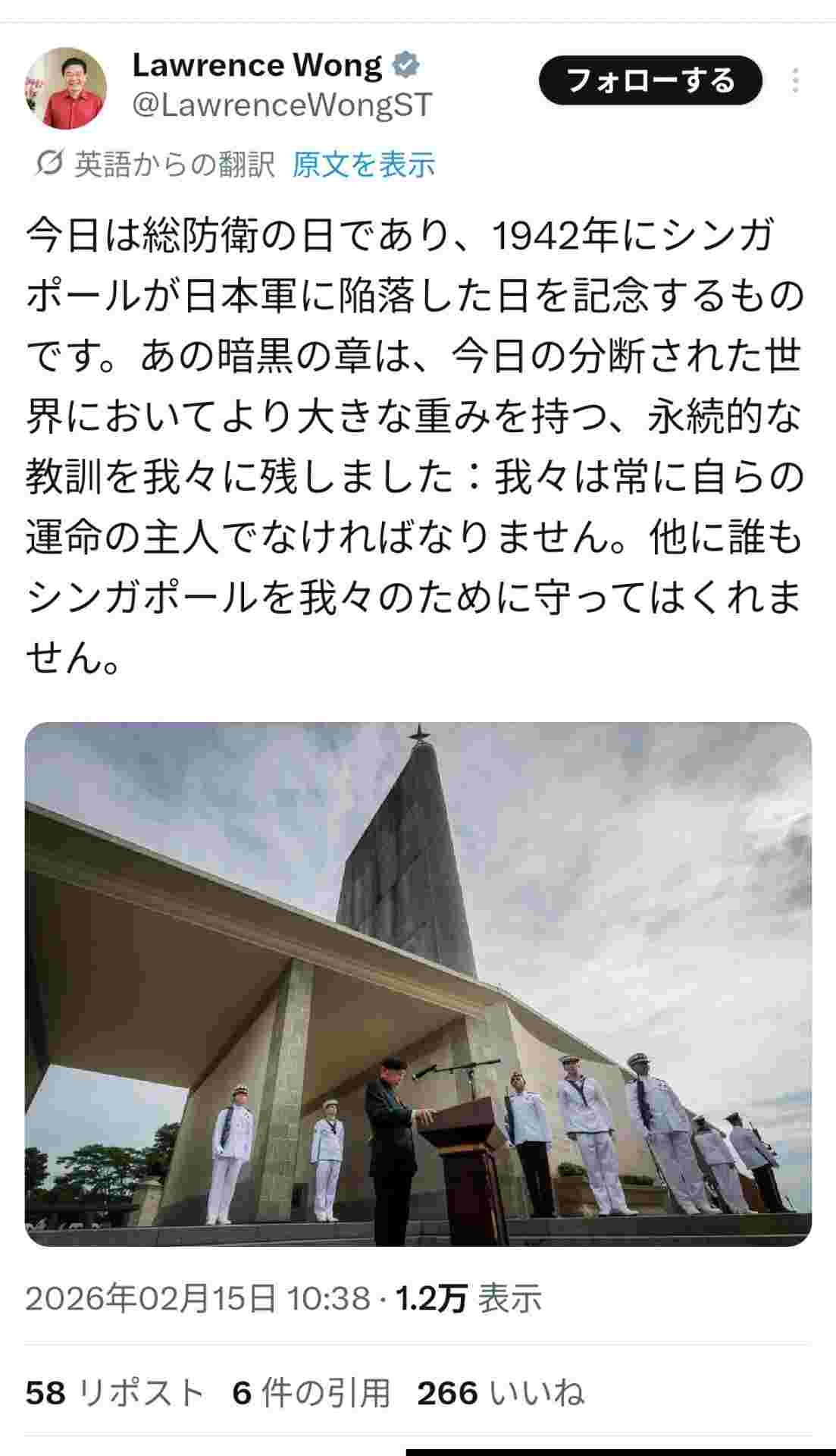 シンガポール首相「今日は総防衛の日、日本に占領された暗黒時代の始まりでした」日本メディアこれをどこも報じず完全無視