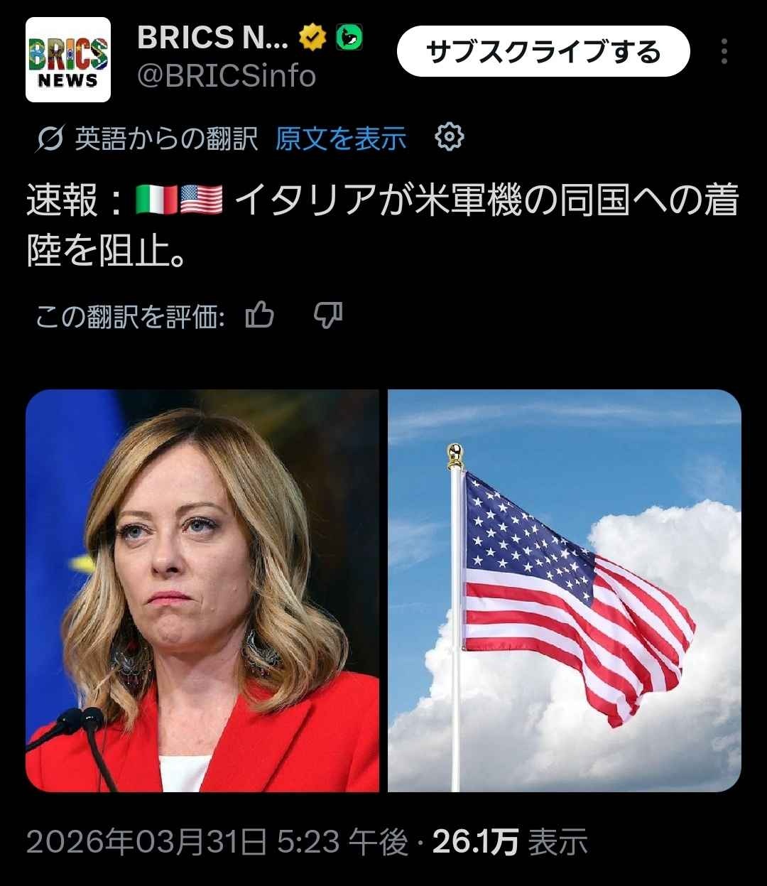 スペインに続きイタリア、米軍機の着陸を拒否🥺意地悪やなあ