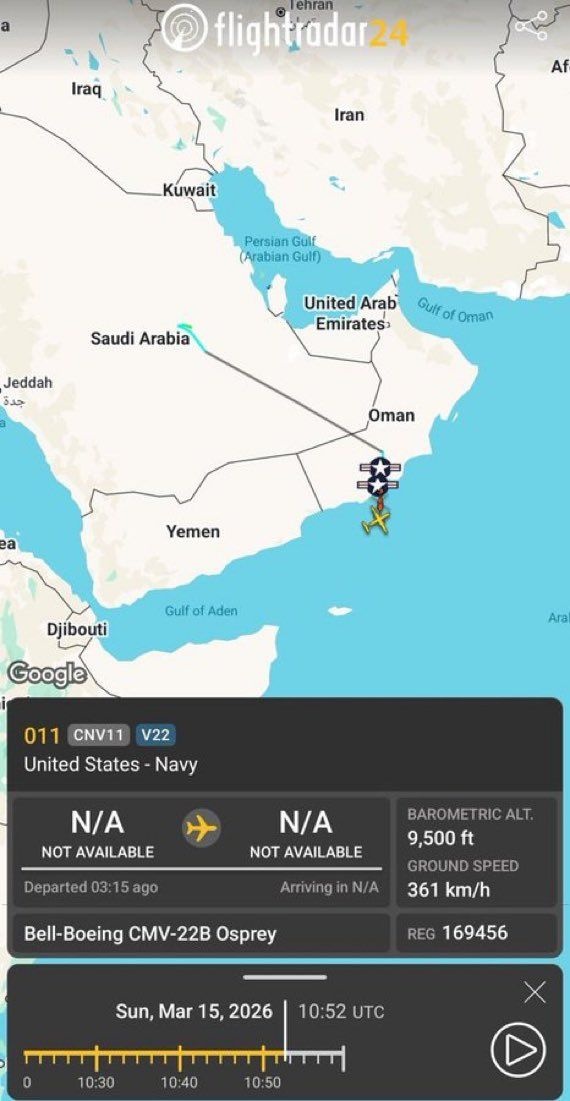 軍艦に所属する航空機の飛行データに基づく報告によると、現在イランから1000km以上離れた位置に移動