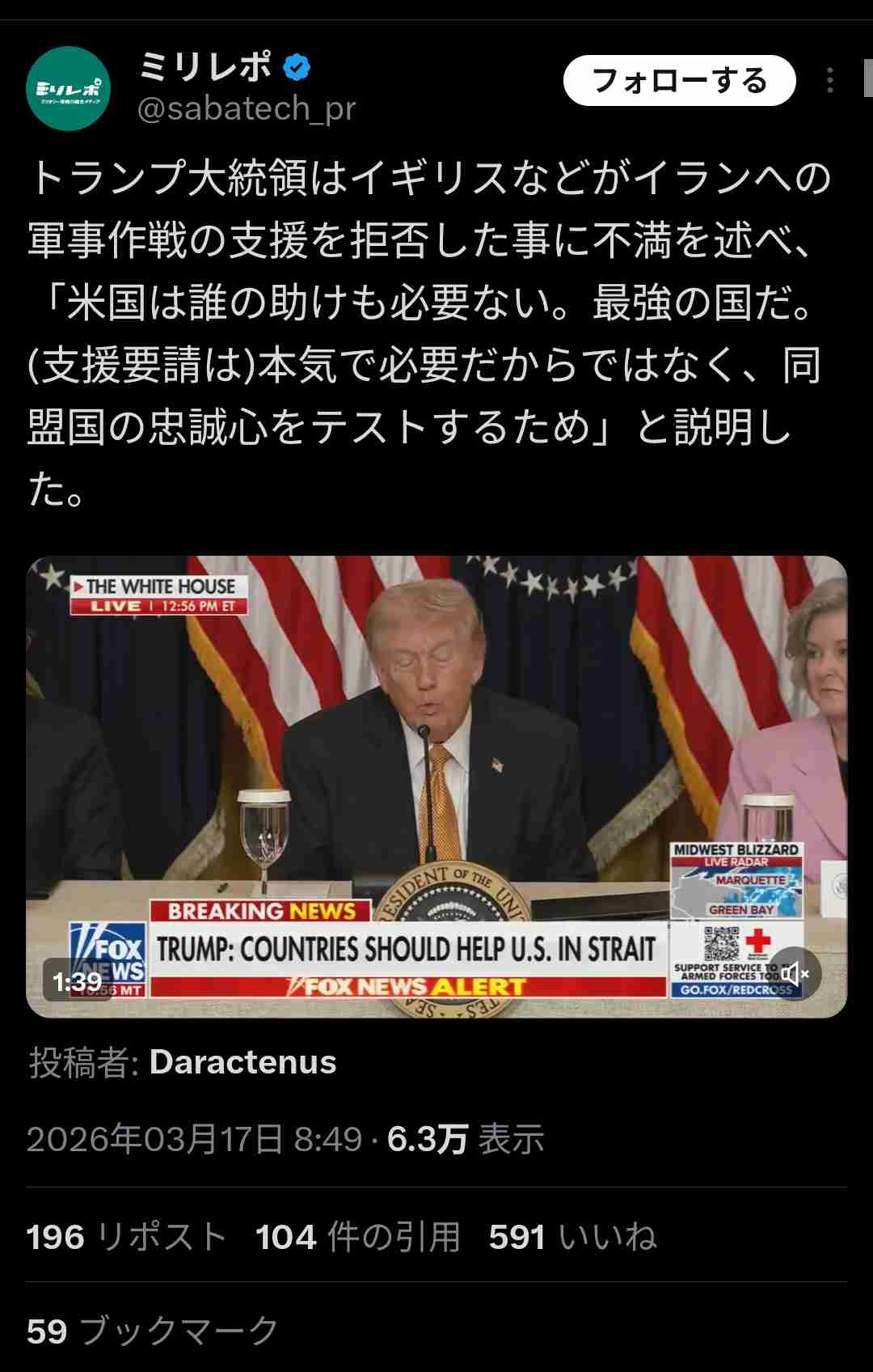 トランプ大統領はイギリスなどがイランへの軍事作戦の支援を拒否した事に不満を述べ、「米国は誰の助けも必要ない。最強の国だ。(支援要請は)本気で必要だからではなく、同盟国の忠誠心をテストするため」と説明した。