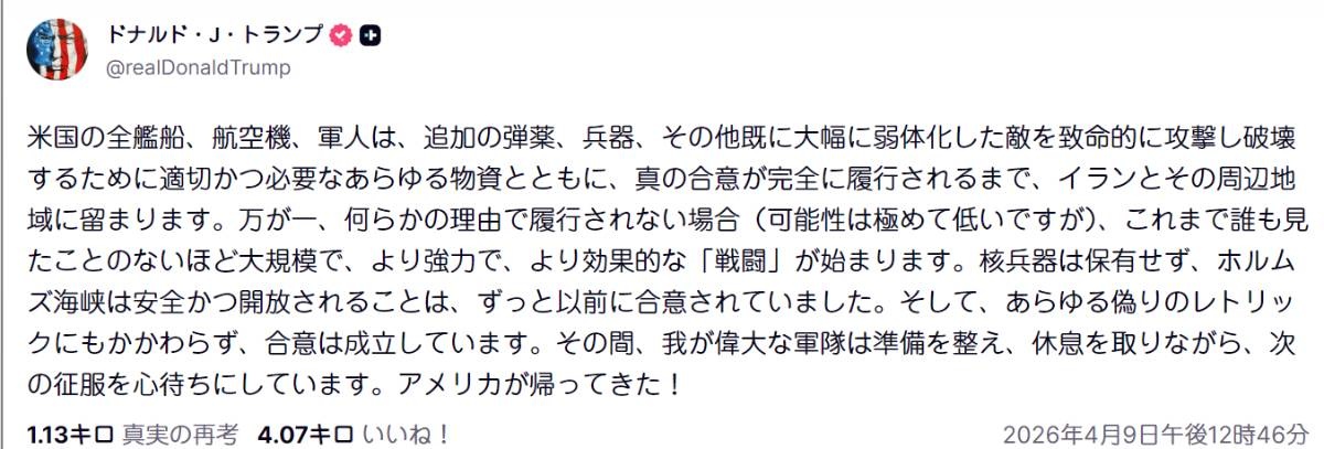すでに著しく弱体化した敵を徹底的に攻撃・殲滅するために適切かつ必要とされる、追加の弾薬、兵器、その他あらゆる物資を備えたすべての米軍艦艇、航空機、および軍関係者は、真の合意が完全に履行されるまで、イラン国内およびその周辺に留まる。万が一、それが遵守されない場合(その可能性は極めて低いものの)、これまでに誰も見たことのないほど大規模で、より優れた、そして強力な「砲撃」が始まることになる。これはずっと以前から合意されていたことであり、反対を唱える偽りのレトリックにもかかわらず、核兵器は存在せず、ホルムズ海峡は開放され、安全が保たれることになる。その間、我々の偉大なる軍隊は装備を整え、休息をとっている。実のところ、次の征服を心待ちにしているのだ。アメリカが帰ってきた!