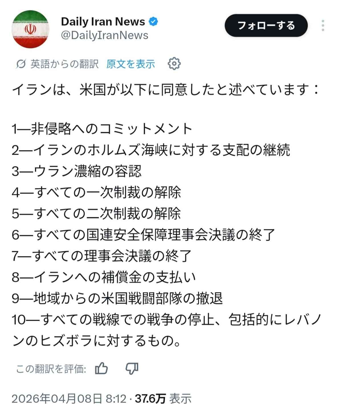 https://x.com/araghchi/status/2041655156215799821 - 5 : 2026/04/08(水) 11:25:26.24 ID:jL1KRl3qM