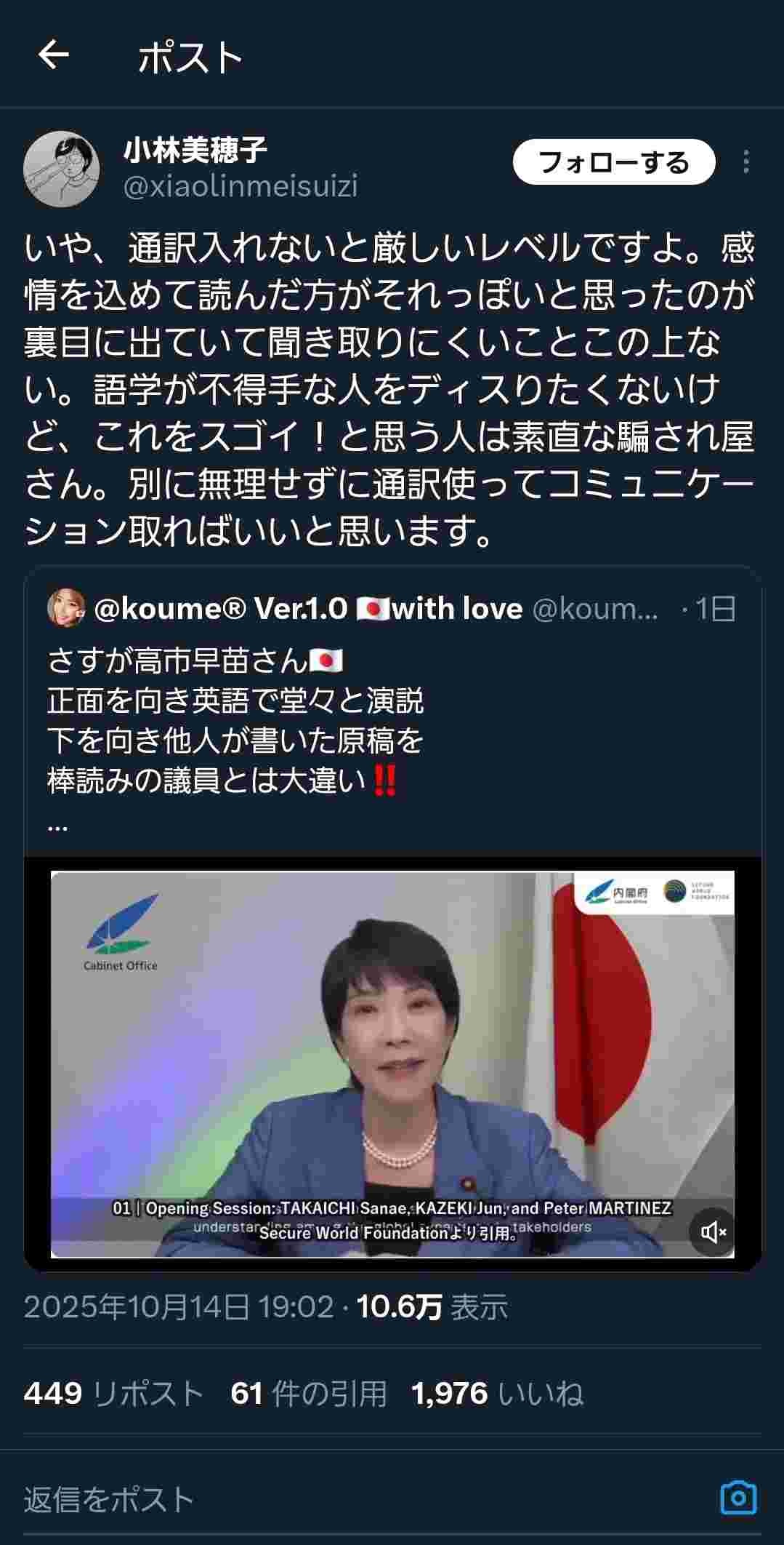 ネトウヨ「高市さん流暢な英語でスピーチしてて凄い!」識者「いや、下手過ぎだしカンペバレバレだろ…」