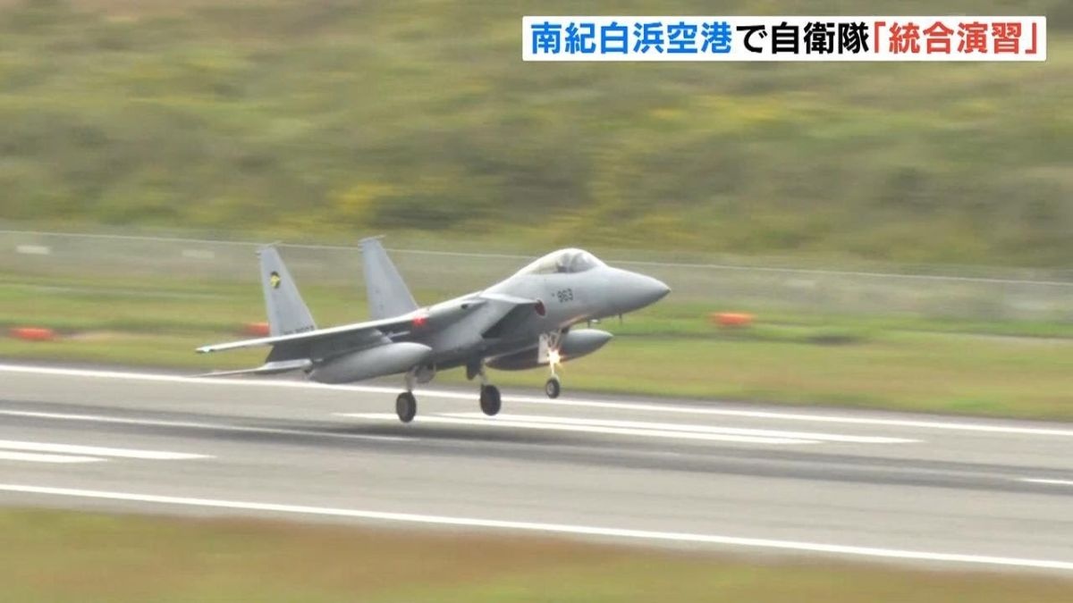 陸海空自衛隊5万人以上が参加して20日から全国各地で実施されている、自衛隊の「統合演習」。和歌山県白浜町の南紀白浜空港では、自衛隊の基地が使えない場合を想定して、航空自衛隊のF-15戦闘機4機が離着陸訓練「タッチ・アンド・ゴー」を行いました。