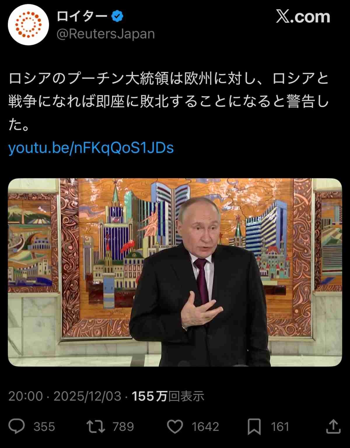 プーチン大統領「ロシアと欧州が戦争になれば、即座に敗北する」と警告
