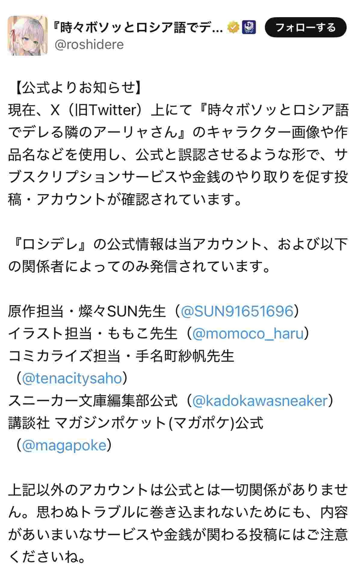 ボソッとロシア語でデレる隣のアーリャさん公式、ブチギレ