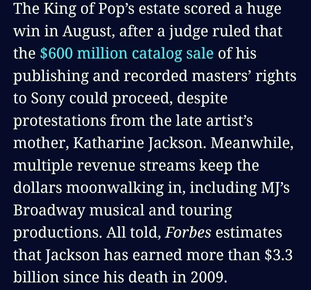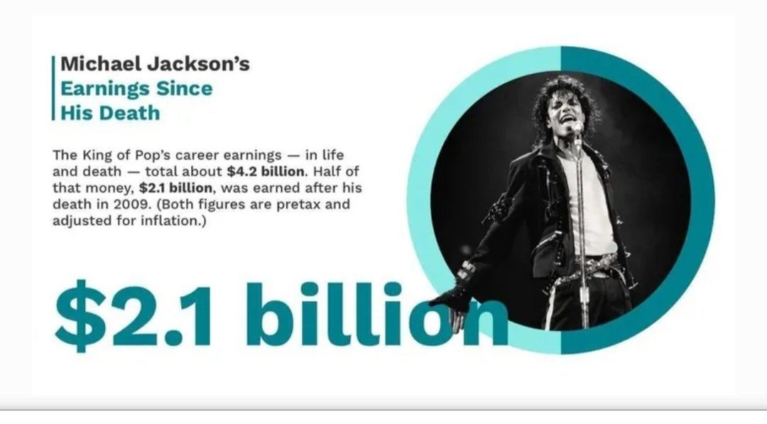 フォーブスによると、マイケル・ジャクソンのキャリア収入は2018年時点で42億ドルで、そのうち21億ドルは彼の生前に稼がれた。2024年までに彼の死後の収入は合計33億ドルに達し、総額54億ドルとなり、彼は死者も生者も、黒人も白人も含めて最も稼いだミュージシャンとなった