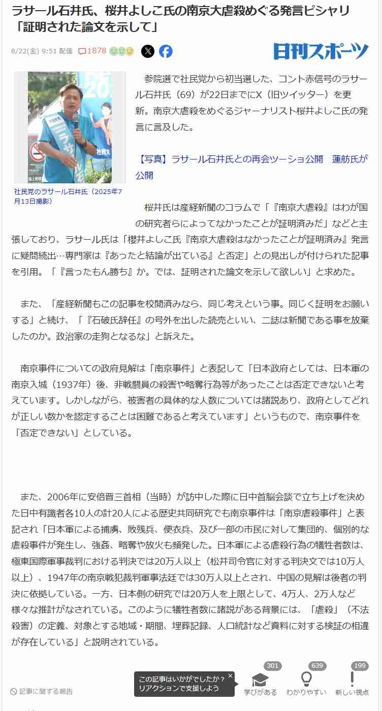 ラサール石井、桜井よしこ氏の南京大虐殺めぐる発言ピシャリ