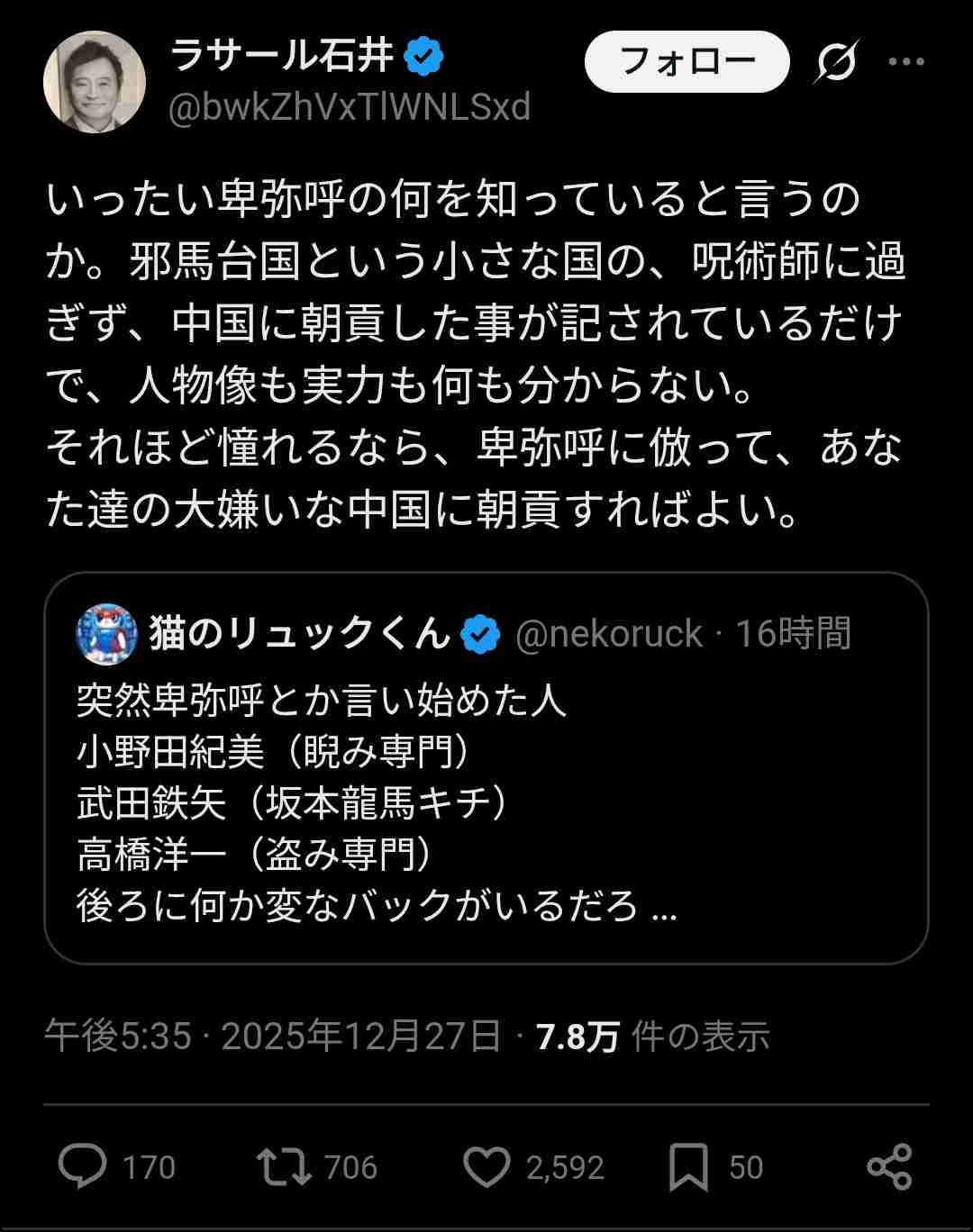 ラサール石井「そんなに卑弥呼が好きなら卑弥呼に倣って、あなた達の大嫌いな中国に朝貢すればよい」