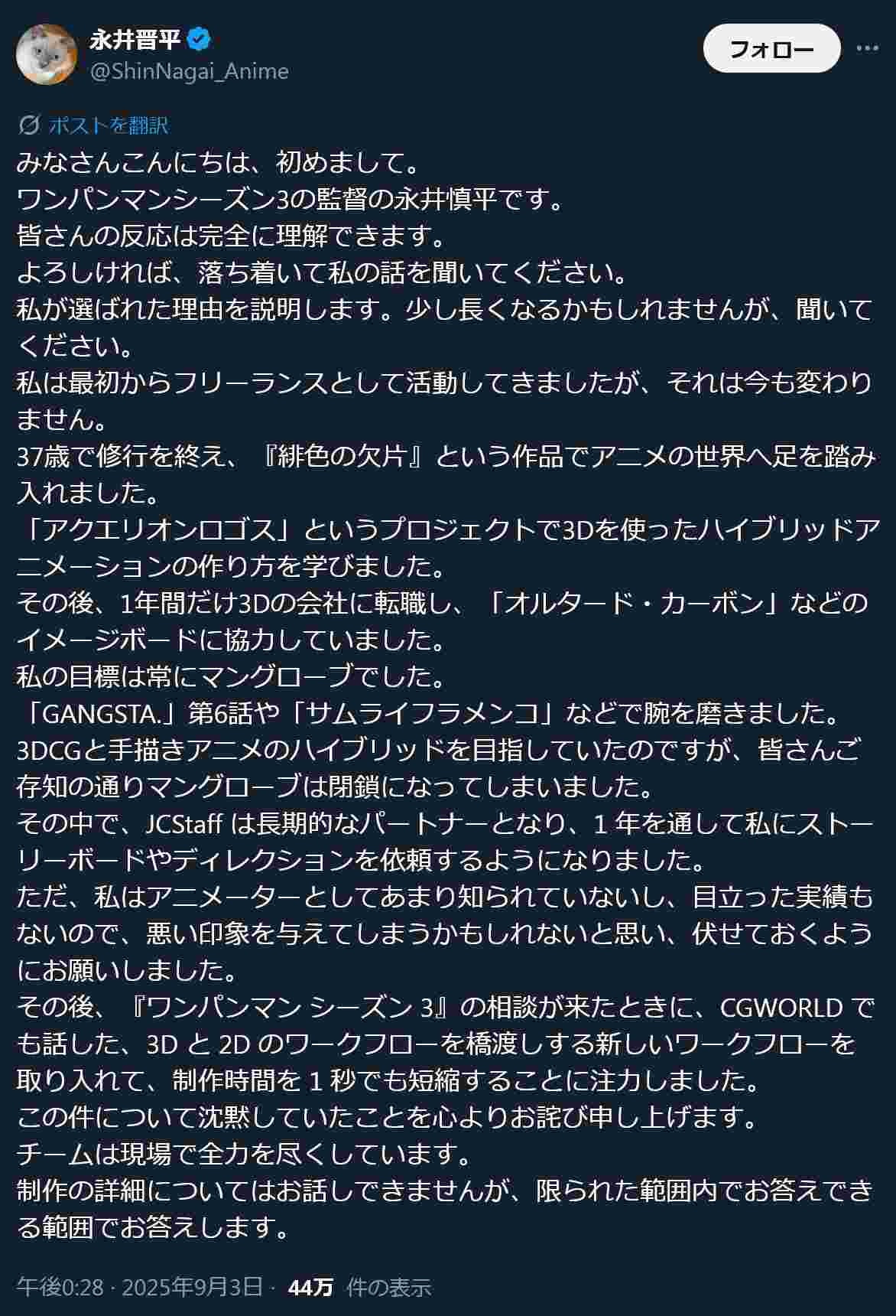 ワンパンマンアニメ3期の監督、アクション描写に定評のない人だったので大炎上し本人が英語で謝罪