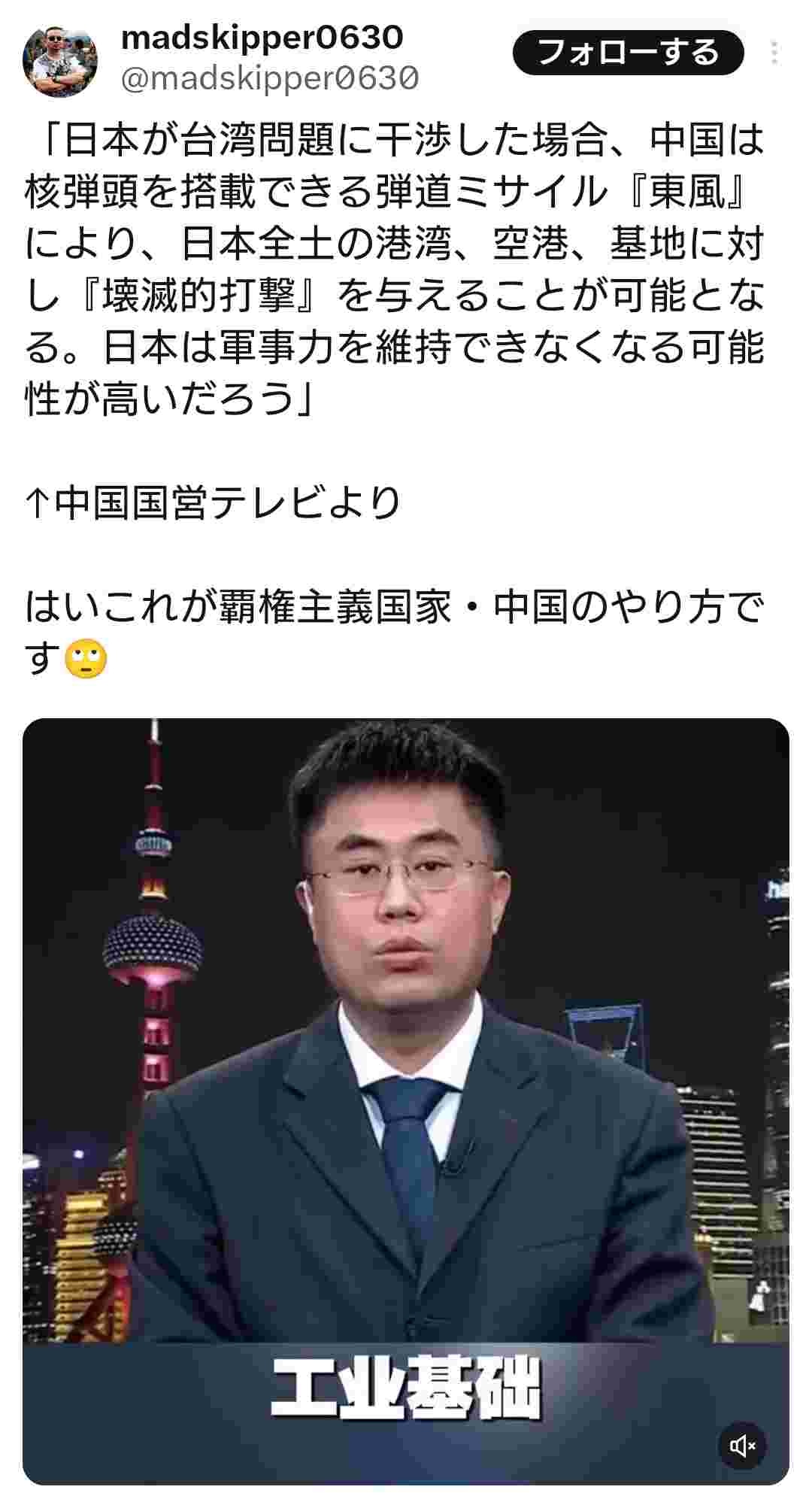 中国「ジャップが台湾に介入したら港、空港、基地全てに核ミサイル打ち込むは」