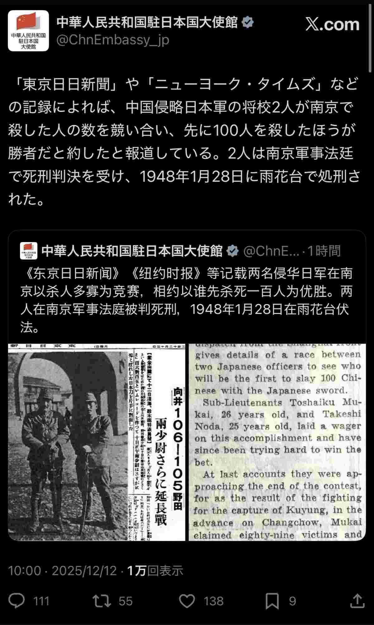 中国日本大使館「うおおおおおおお!!南京大虐殺!!南京大虐殺!!」