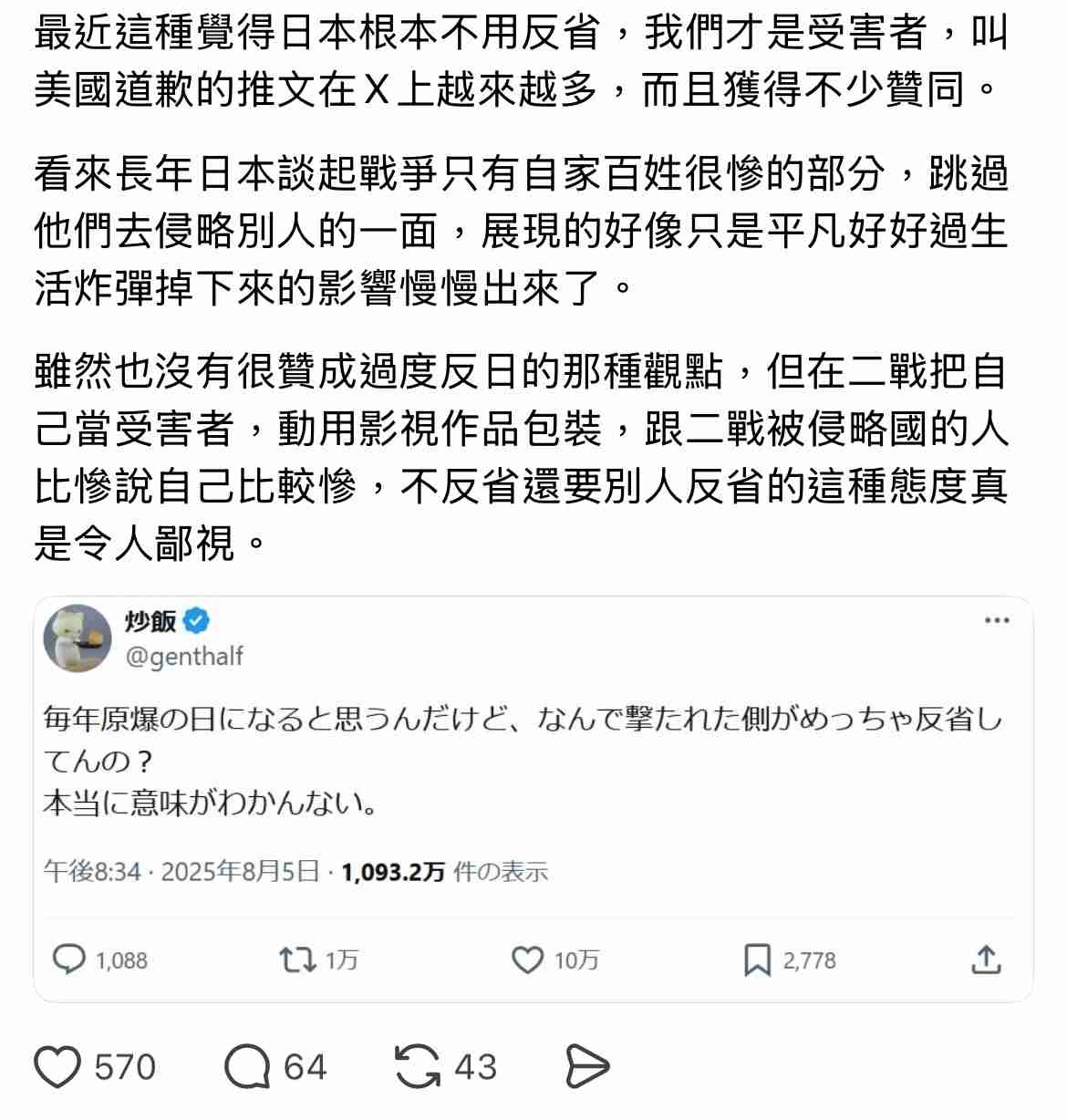 最近、「日本は全く反省する必要がない。私たちこそ被害者だ。アメリカに謝罪させるべきだ」といった主張のポストがX(旧Twitter)でどんどん増えていて、しかもかなり支持を集めている。