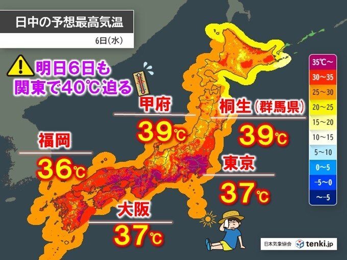 今日5日は、群馬県伊勢崎市で41.8℃を記録。過去の歴代最高気温を大幅に超え、歴史的な暑さとなりました。40℃以上は関東の14地点で観測され、過去最多記録を大幅に更新。夜間も熱中症に厳重な警戒が必要です。明日6日の日中は今日5日ほどではないものの、40℃に迫る所も。