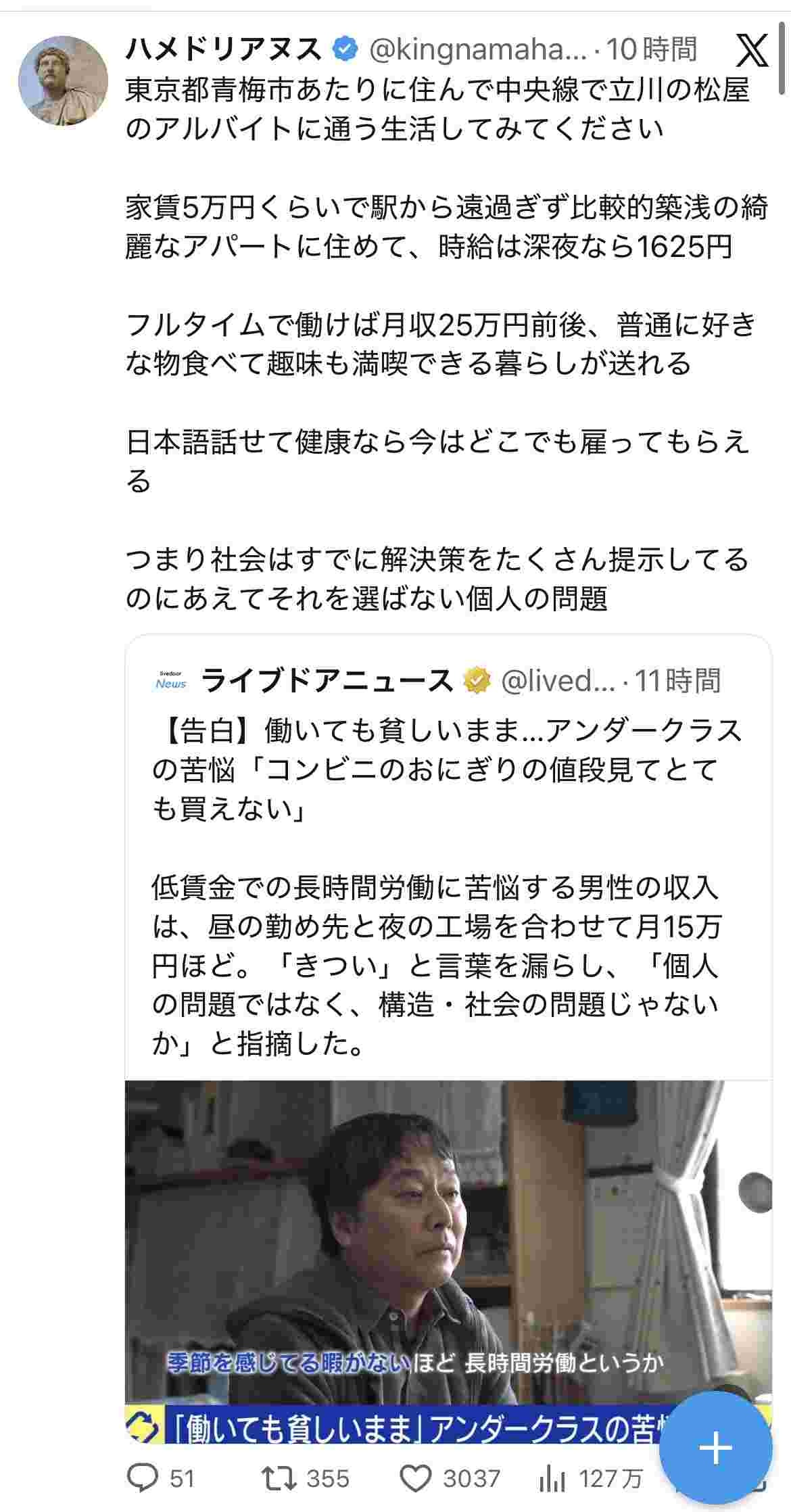 低賃金労働者「個人の問題でなく社会の問題でないか」愛国者「日本語話せて健康なら今はどこでも雇ってもらえる。個人の問題」