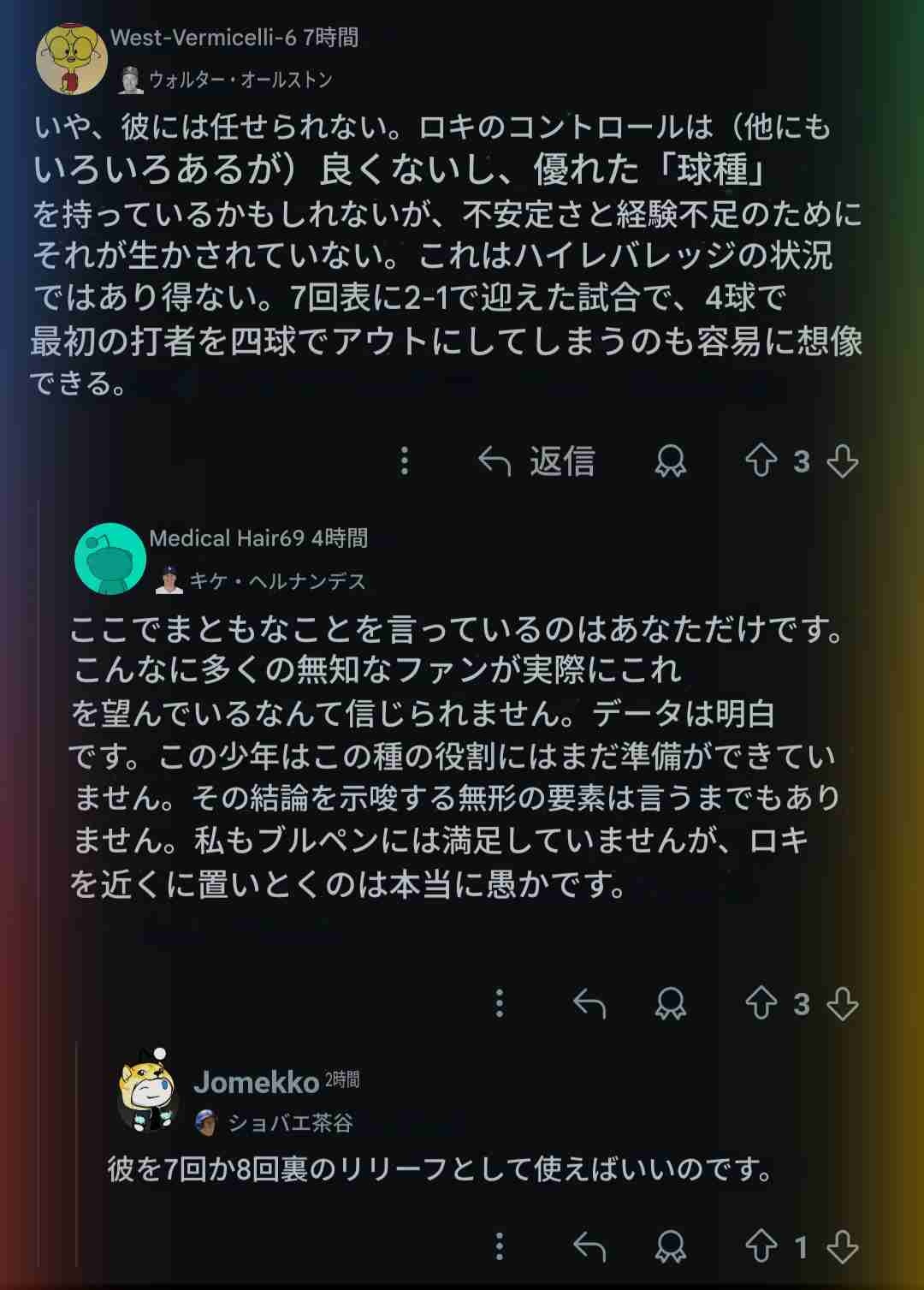 - 3イニング5失点する中継ぎ陣なんだから別にロキが投げてもいいだろ