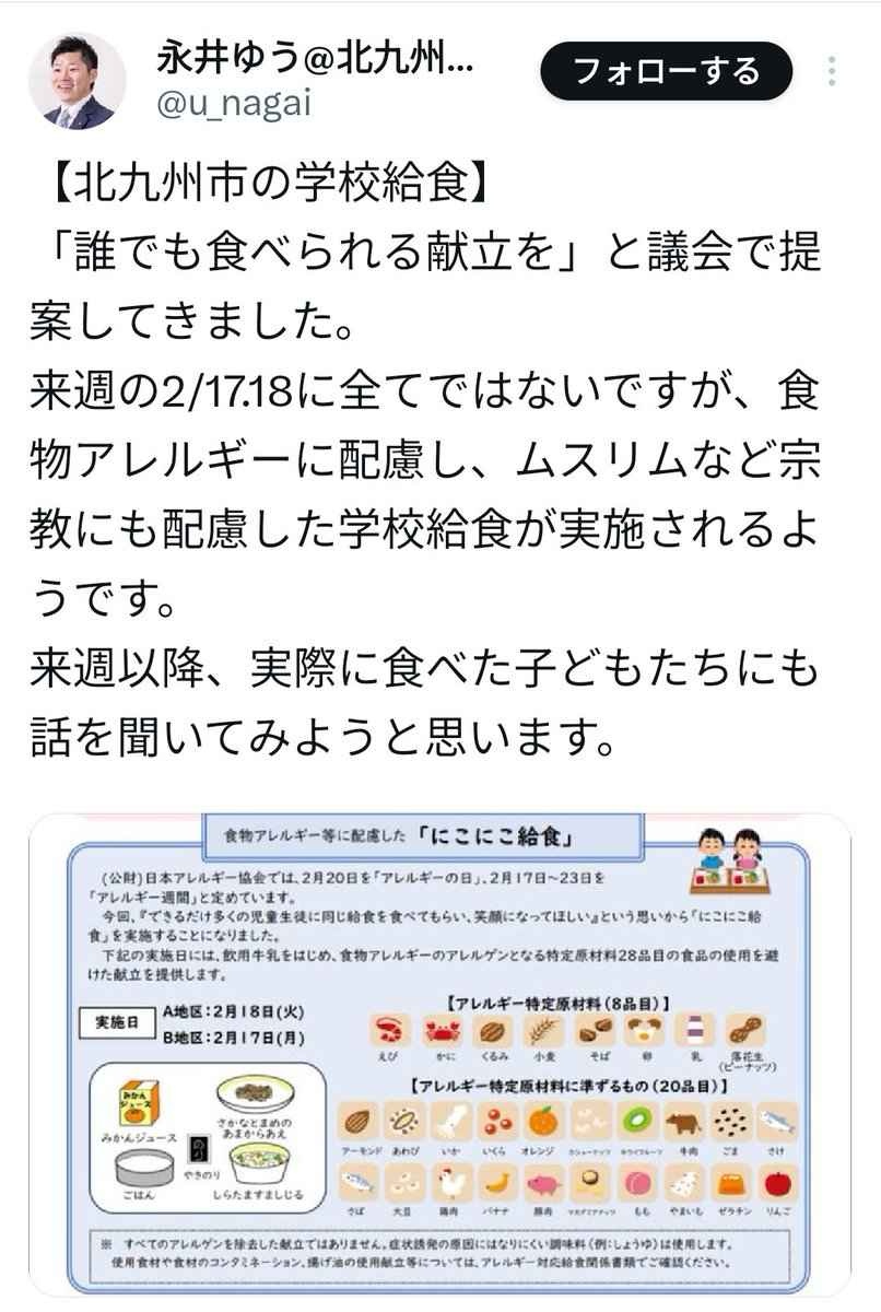 アフガニスタン出身者、北九州市に「学校給食で豚肉、ポークエキスの除去」を陳情「弁当を持たせるのは負担」→ 北九州市議「来週、全てではないですが、食物アレルギーに配慮し、ムスリムなど宗教にも配慮した学校給食が実施」