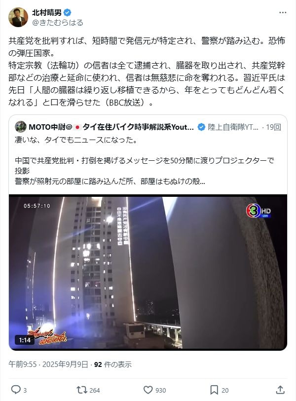 北村晴男「中国共産党、特定宗教の信者は全て逮捕、臓器を取り出され、共産党幹部などの治療と延命に使われる恐怖の弾圧国家
