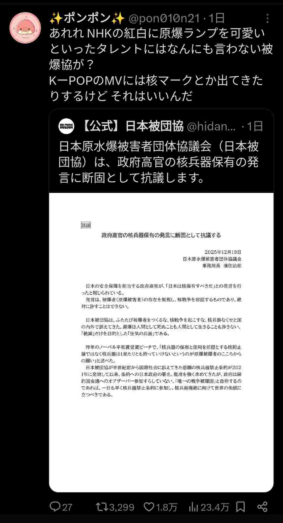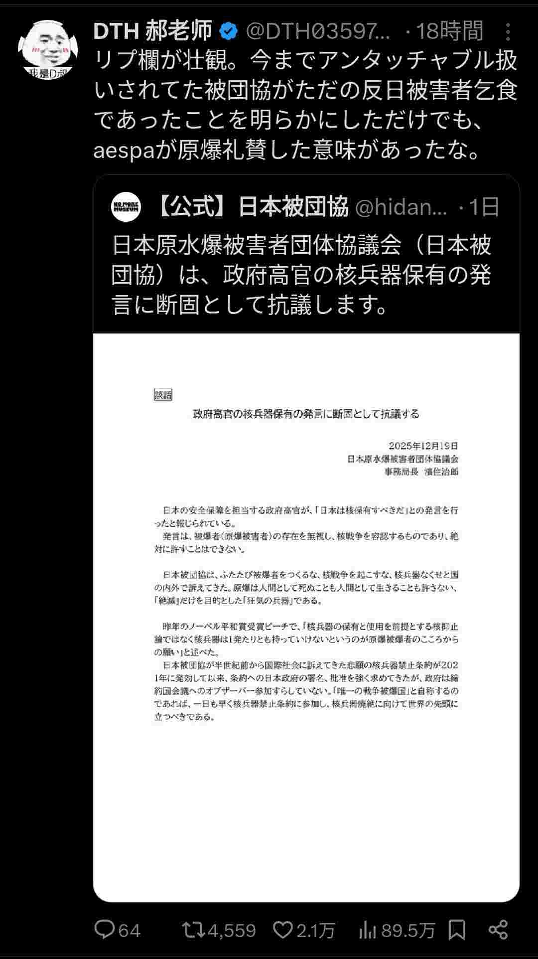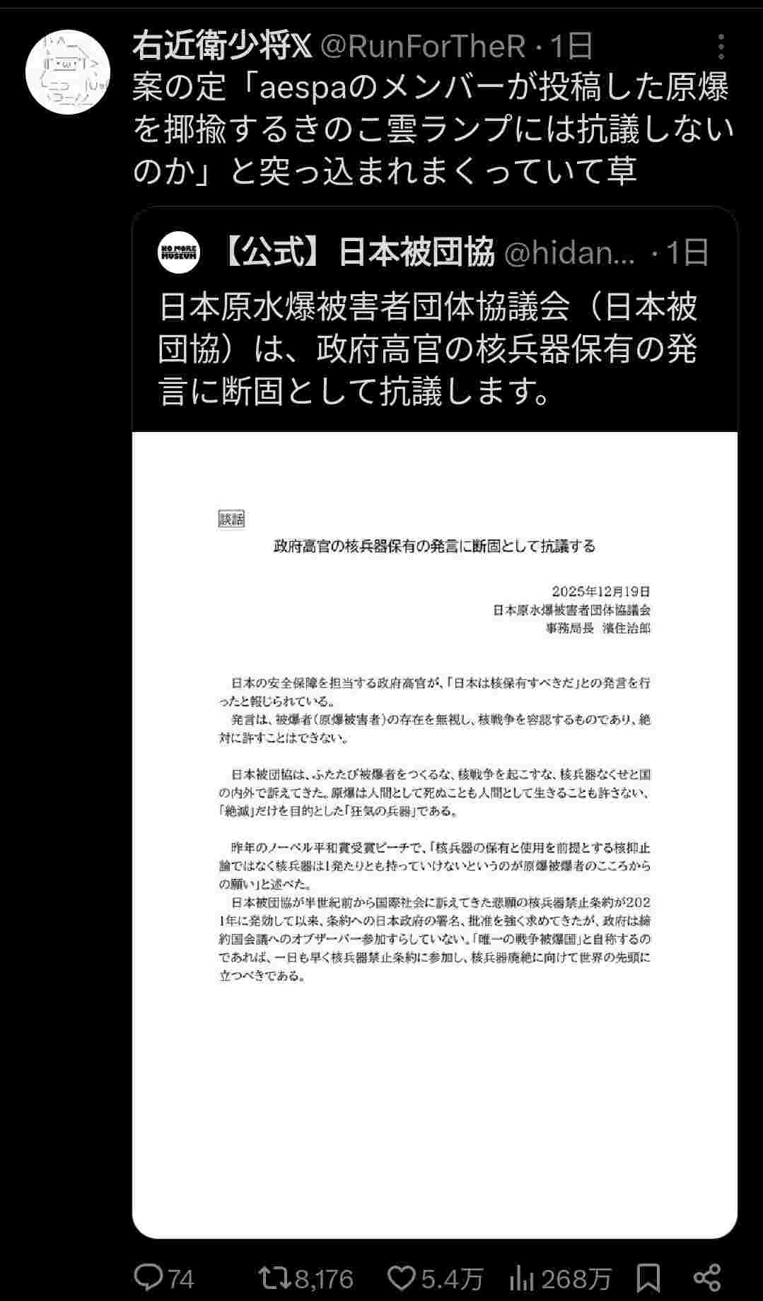 原爆被団協「政府高官の核保有発言に反対します」ネトウヨ「aespaにも抗議しろおおおおおお!!!💢」→万バズ連発www