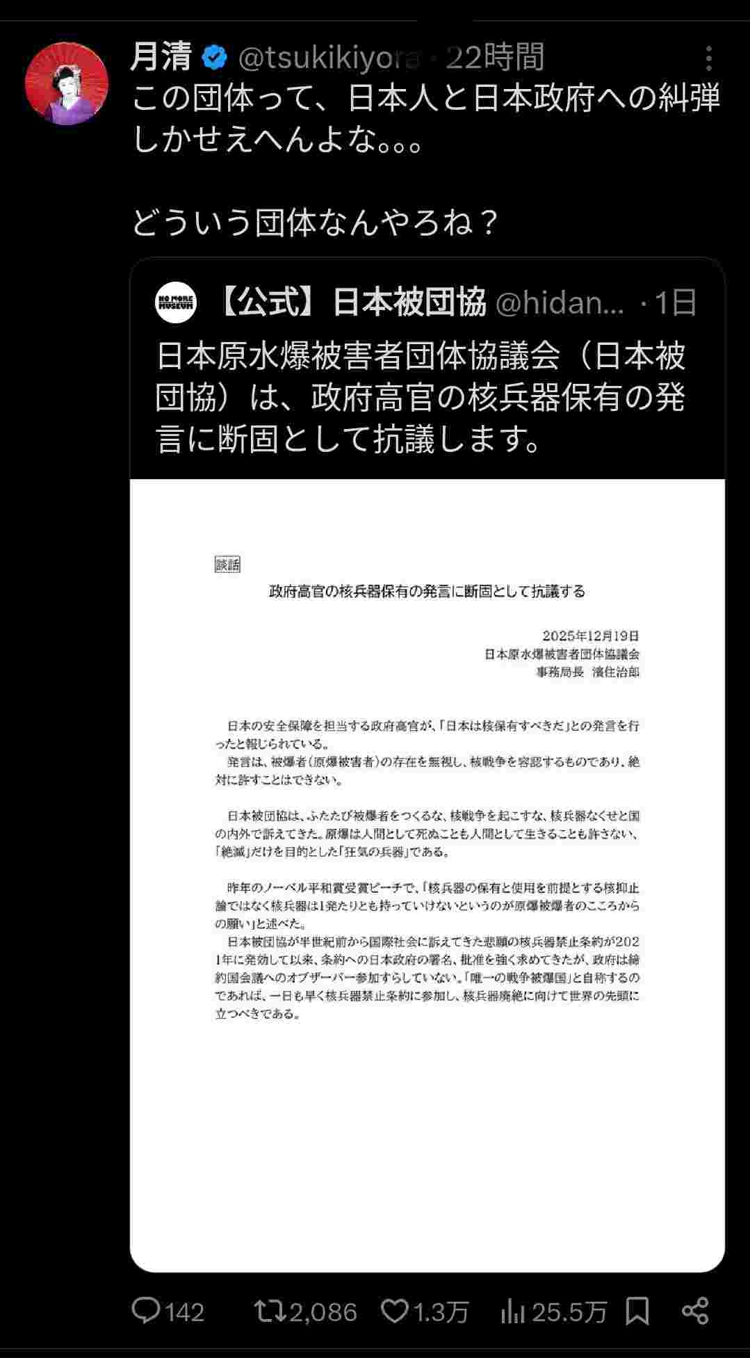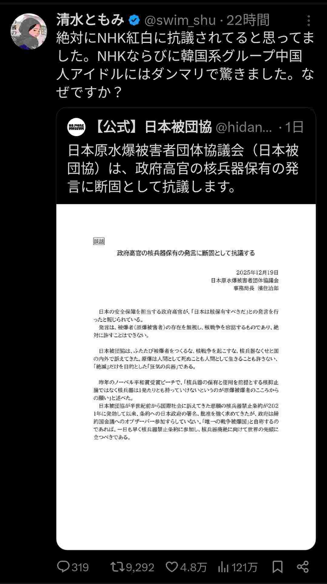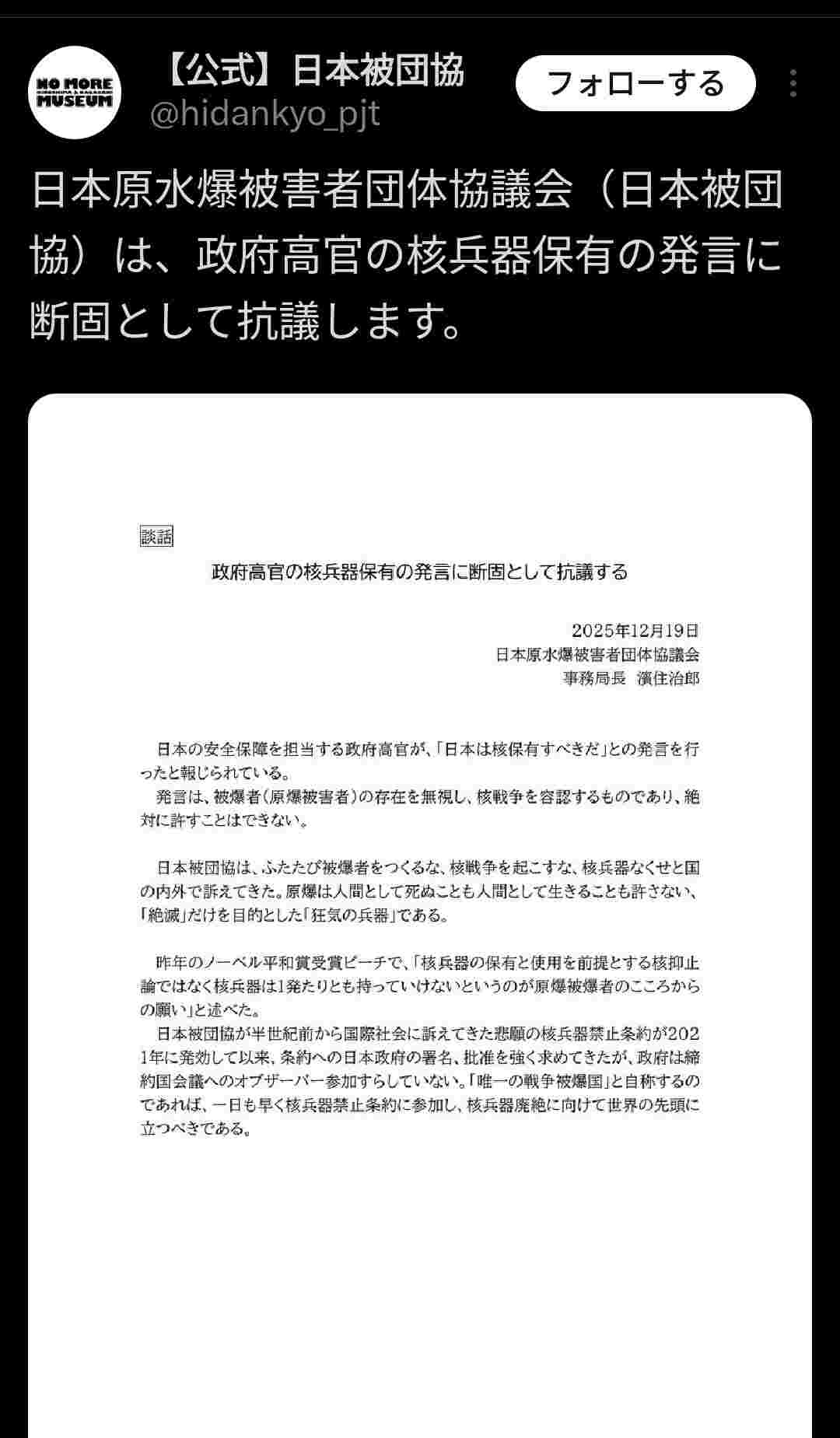 原爆被団協「政府高官の核保有発言に反対します」ネトウヨ「aespaにも抗議しろおおおおおお!!!💢」→万バズ連発www