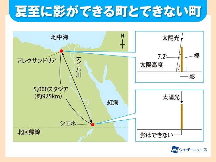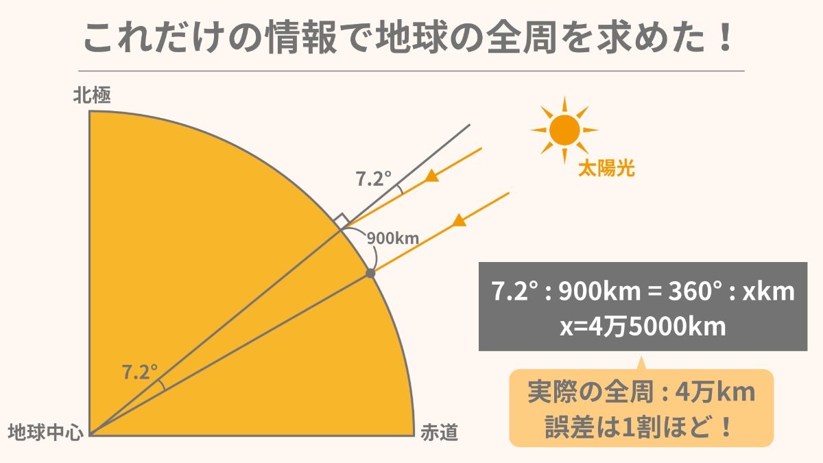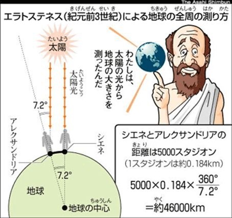 - 古代ギリシャ人「同時刻に異なる都市で同じ長さの棒を地面に刺して影の長さの違いと都市間の距離から地球の大きさ計算したろ!」