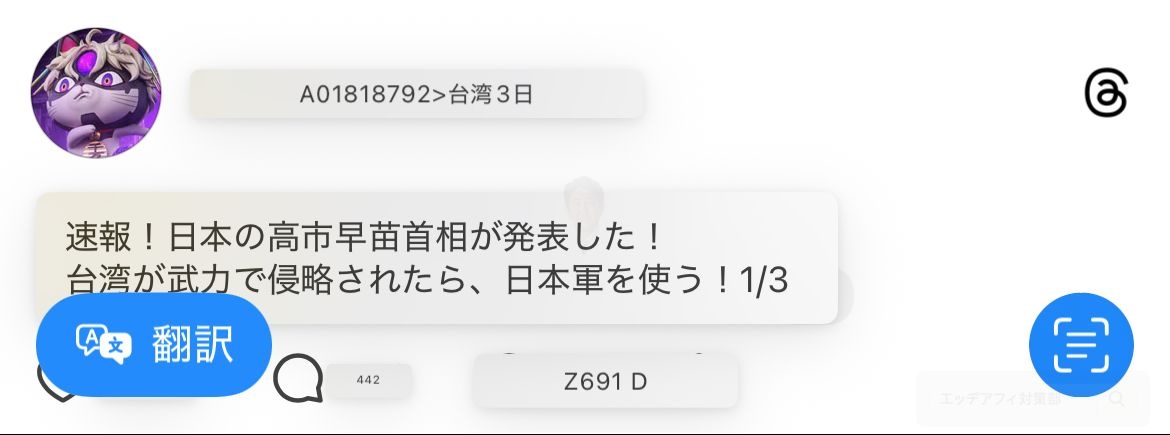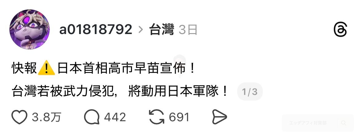 台湾人「よっしゃアア!!!ついに日本が台湾のために中国と戦争することを宣言したぞォォ!!!」3.8万いいね👍