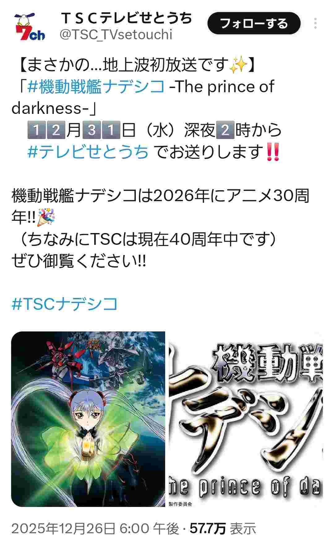 #テレビせとうち でお送りします??機動戦艦ナデシコは2026年にアニメ30周年!!??