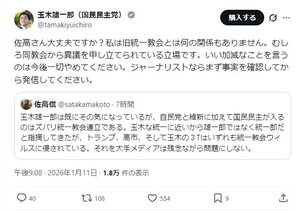 玉木はそれを否定する材料を示してから反論すべき - 23 : 2026/01/11(日) 22:06:12.75 ID:xglQiFXc0