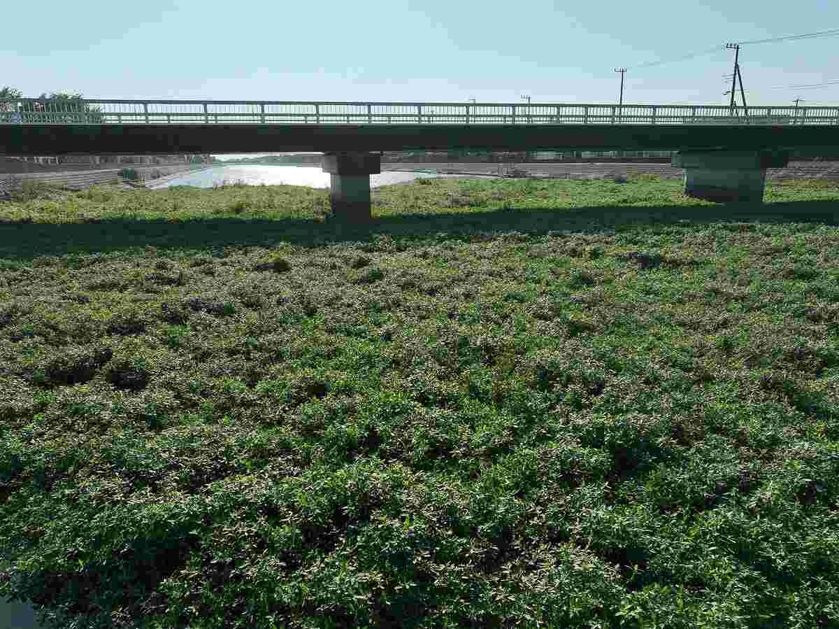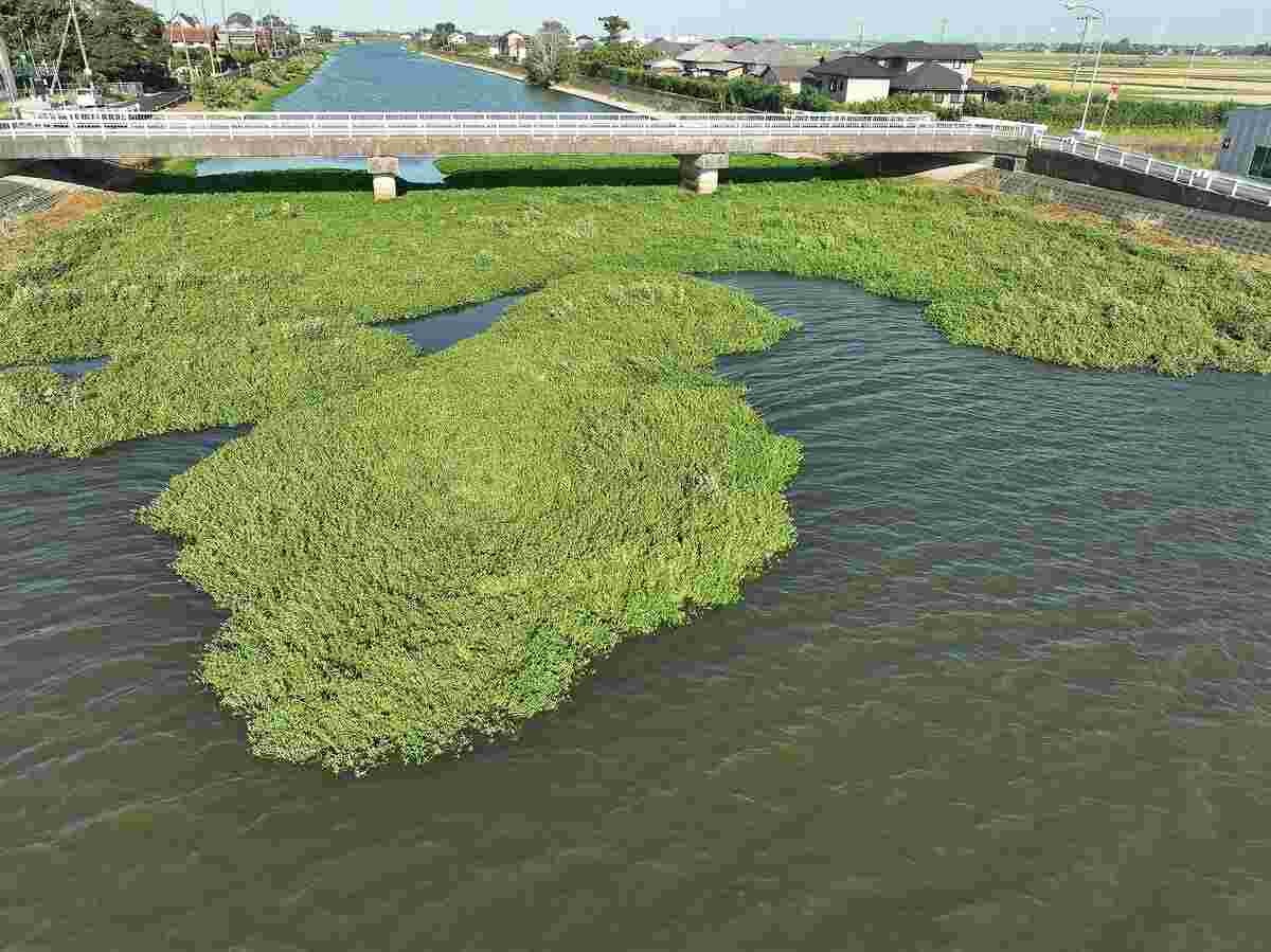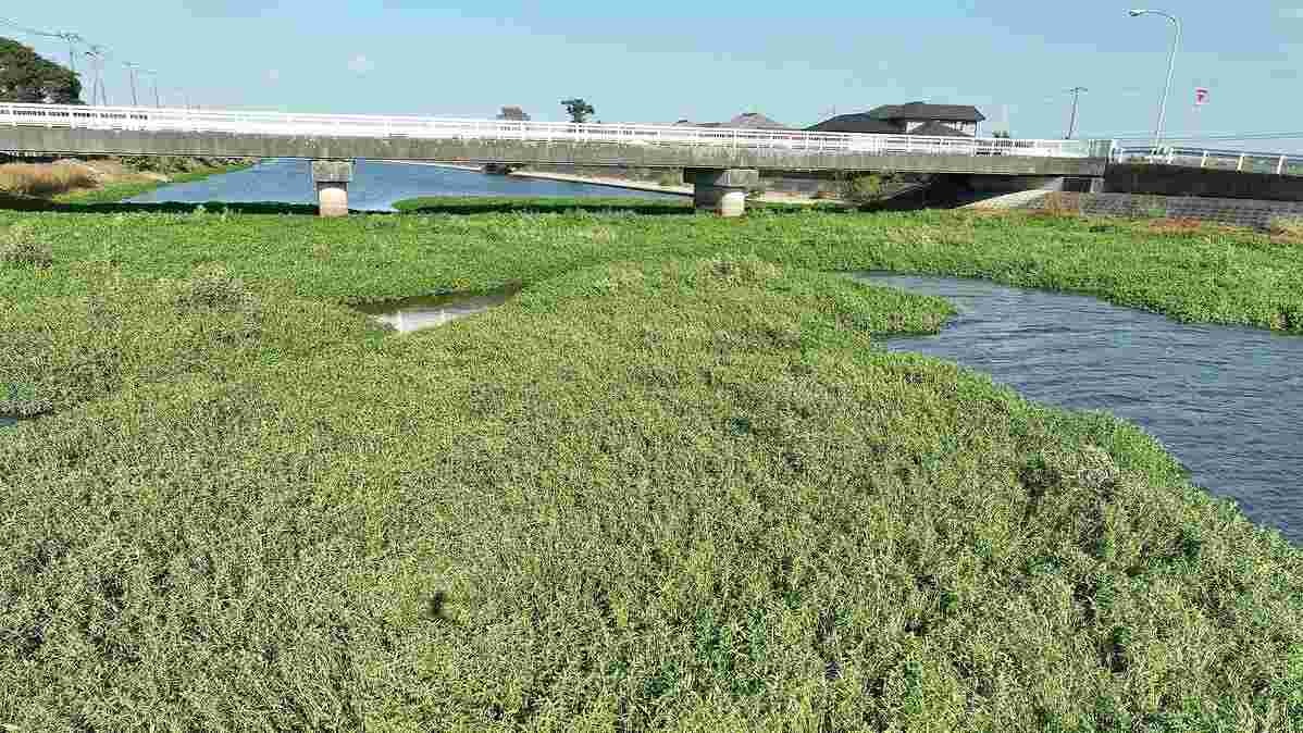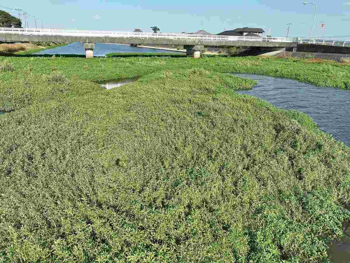 【現在】新利根川の水面を覆い尽くすナガエツルノゲイトウ。収穫をひかえる水田でも繁殖し農作物が大打撃を受ける可能性も