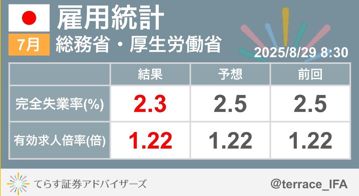 完全失業率7月は2.3%に改善、5年7カ月ぶり低水準 有効求人倍率は横ばい