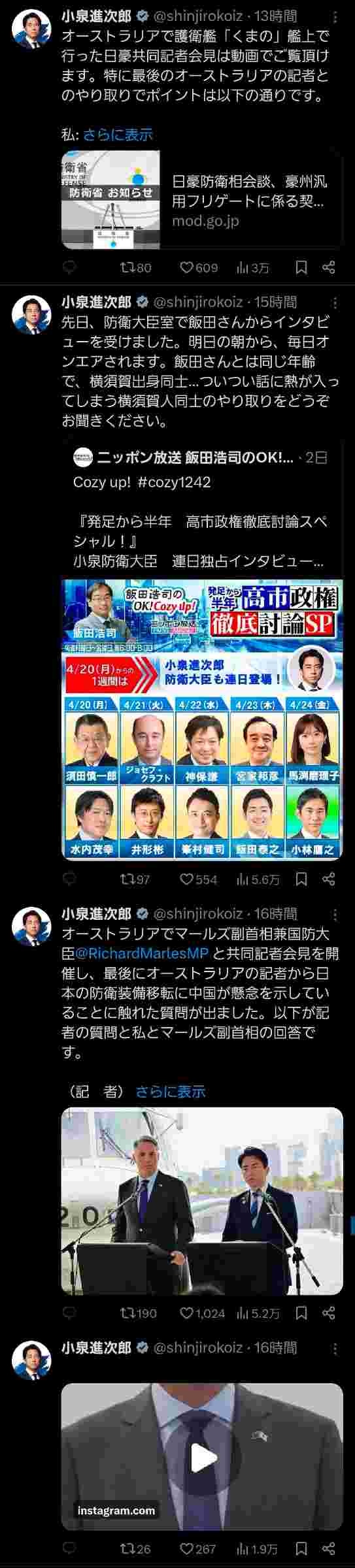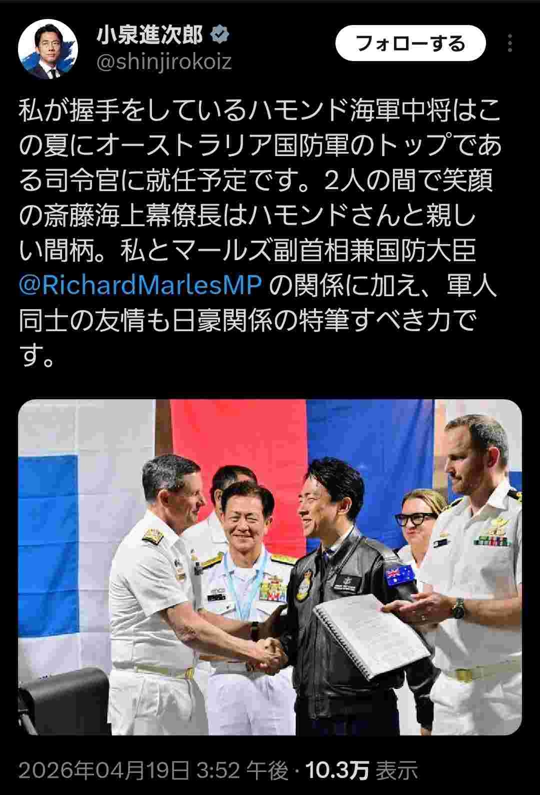 小泉の進さん、何かに取り憑かれたように怒涛のX連投😲おまけに日豪幹部の交流を「軍人同士の友情」と表現