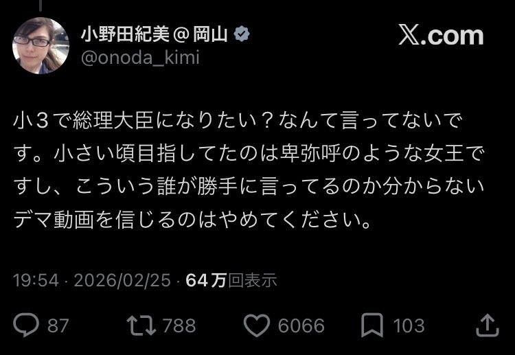 小野田紀美「デマはやめて!小3で総理大臣なりたいなんて言ってない、目指してたのは卑弥呼」