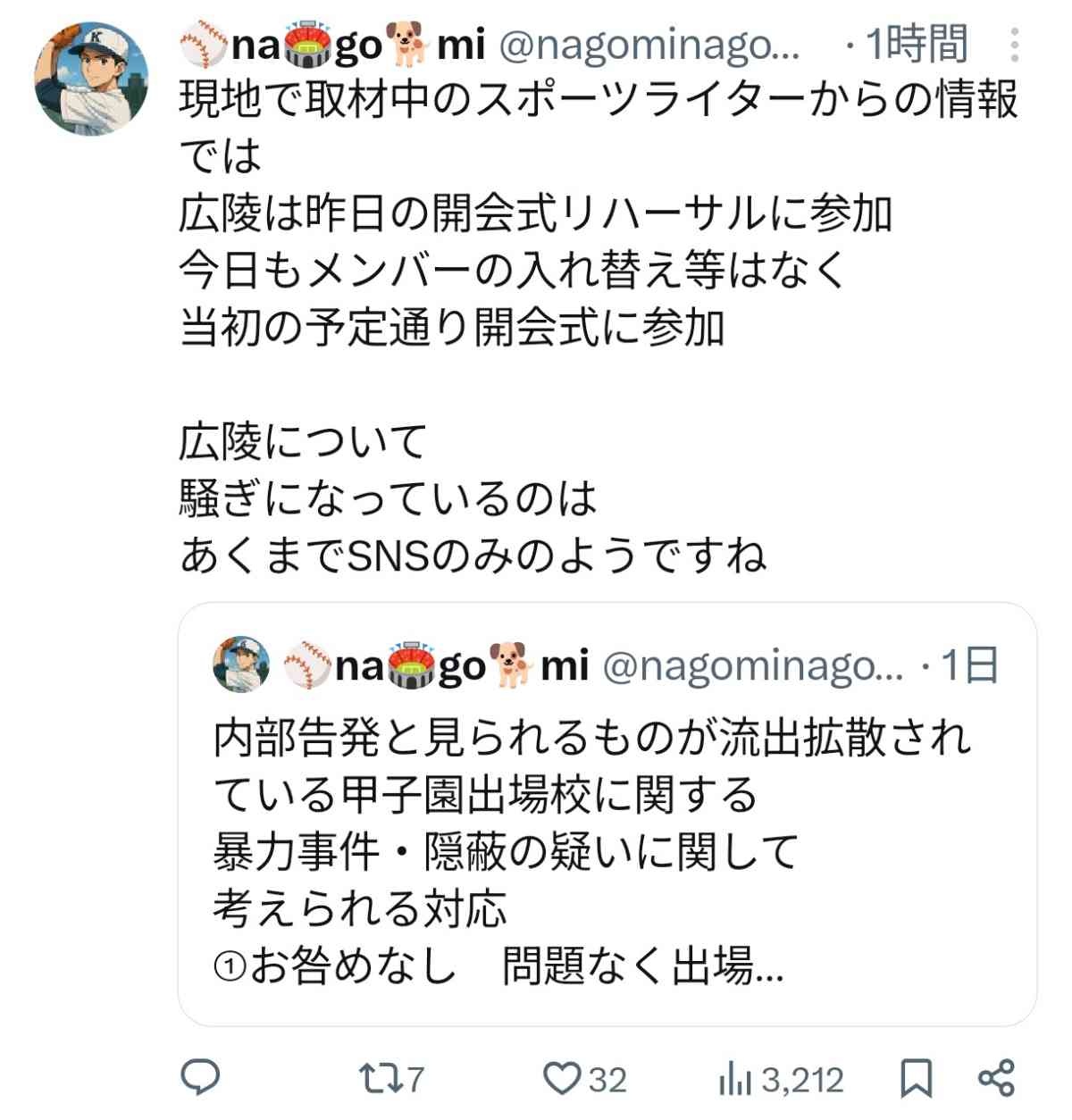 確定してから騒げよと昨日教えてあげたのにおまえら聞く耳持たなかったよな?そもそも甲子園直前で情報出してくるあたりが大会そのものを潰そうとしてて気分悪いしもし仮に事実だとしても大会終わってからにしろよって世論になるのは当然では?