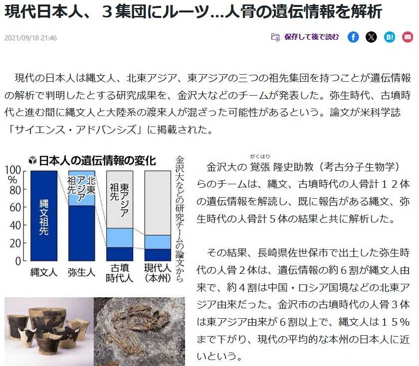 現代日本人、3集団にルーツ…人骨の遺伝情報を解析