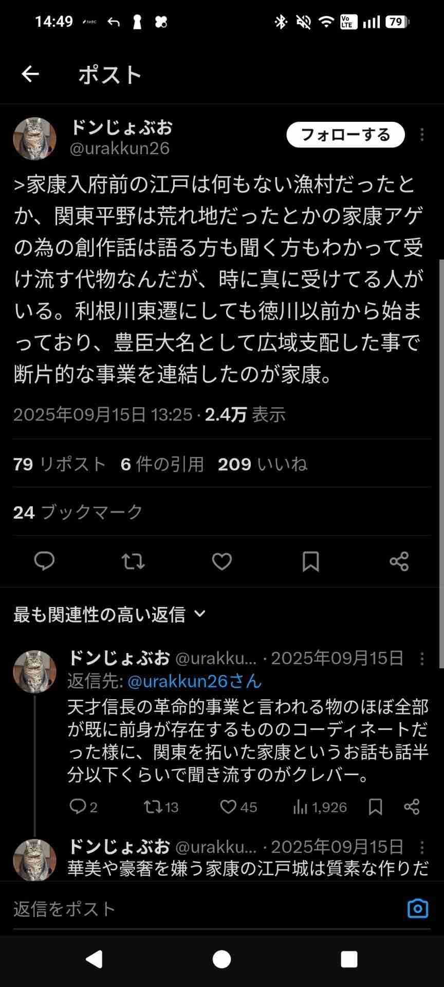 >家康入府前の江戸は何もない漁村だったとか、関東平野は荒れ地だったとかの家康アゲの為の創作話は語る方も聞く方もわかって受け流す代物なんだが、時に真に受けてる人がいる。利根川東遷にしても徳川以前から始まっており、豊臣大名として広域支配した事で断片的な事業を連結したのが家康。