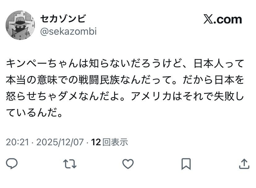 今の日本じゃ大日本帝国と戦争しても負けるよ。 - 75 : 2025/12/08(月) 01:56:11.55 ID:DHLeme+s0