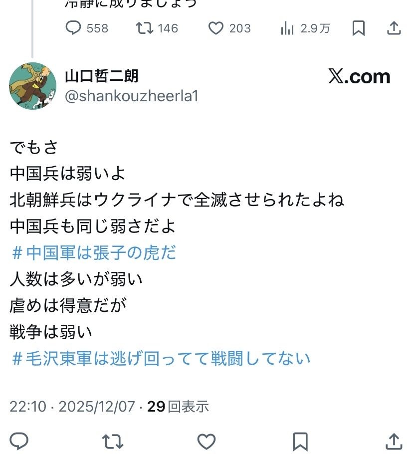 愛国者「中国軍は弱い、必ず退却する。敗戦について心配するのは誤りである」