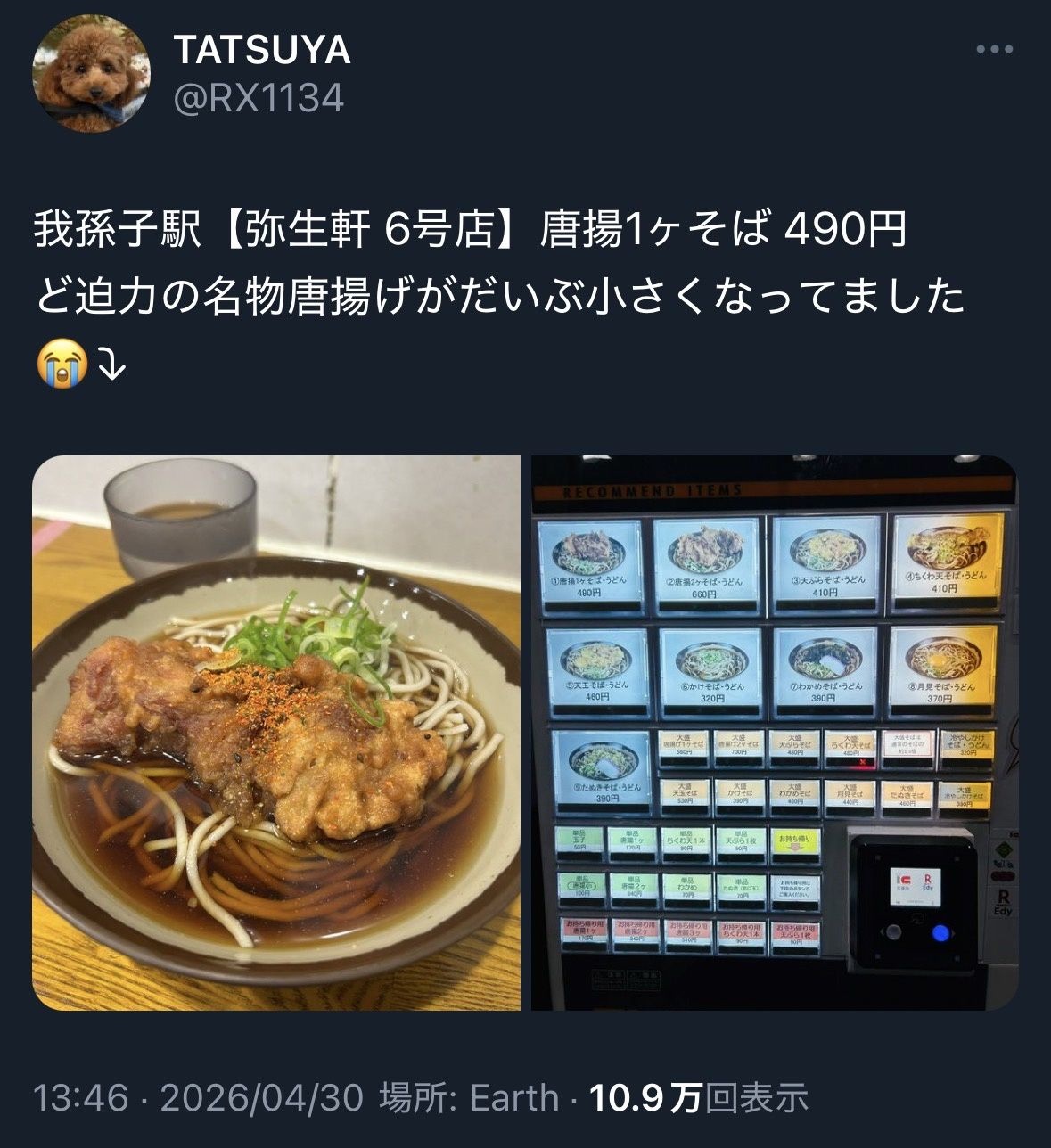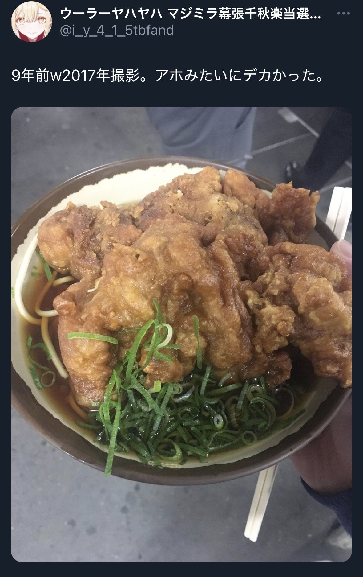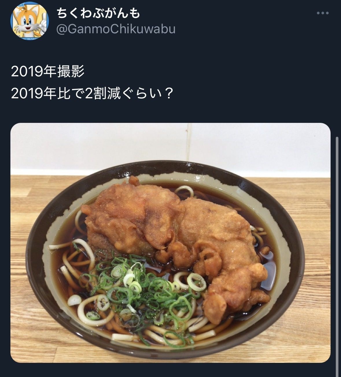 - 俺のよく行くそば屋もとり天が小さくなっててつれえ