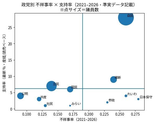 政党別に不祥事発生率(報道ベース2021年-2026年)と支持率(産経・読売最新支持率参照)を並べたら、