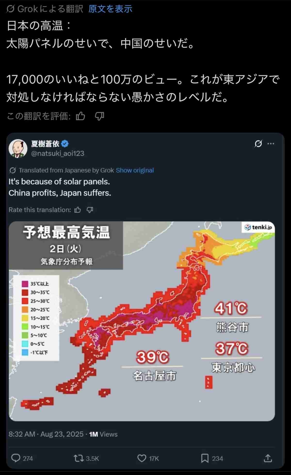 - 中国のメガソーラーのせいで地球温暖化になってる!という主張がバカにされてる模様