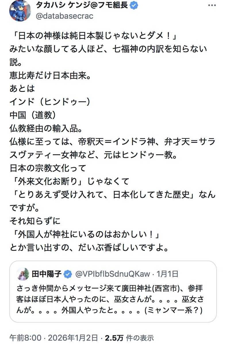 七福神が外国由来なのと巫女がミャンマー人なのとなんの関係が?