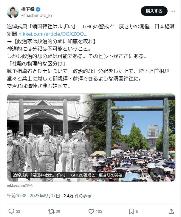 橋下徹「戦争指導者と兵士について政治的な分祀をした上で、陛下と首相が堂々と兵士に対して御親拝・参拝できる靖国神社しろ」