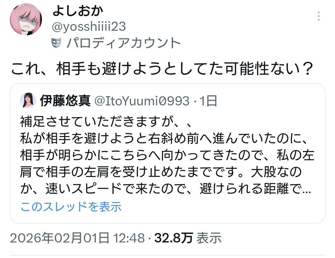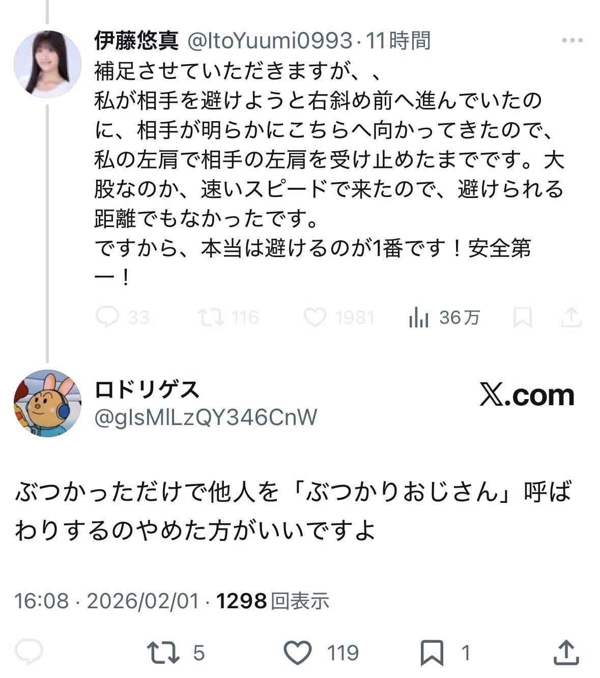 そもそも初手でこの女もぶつかりに行ってる構図なのにさもぶつかられたように言ってる嘘松と、それを指摘されてる構図だから論外やろ - 15 : 2026/02/03(火) 07:52:02.315 ID:6PWY1FES4