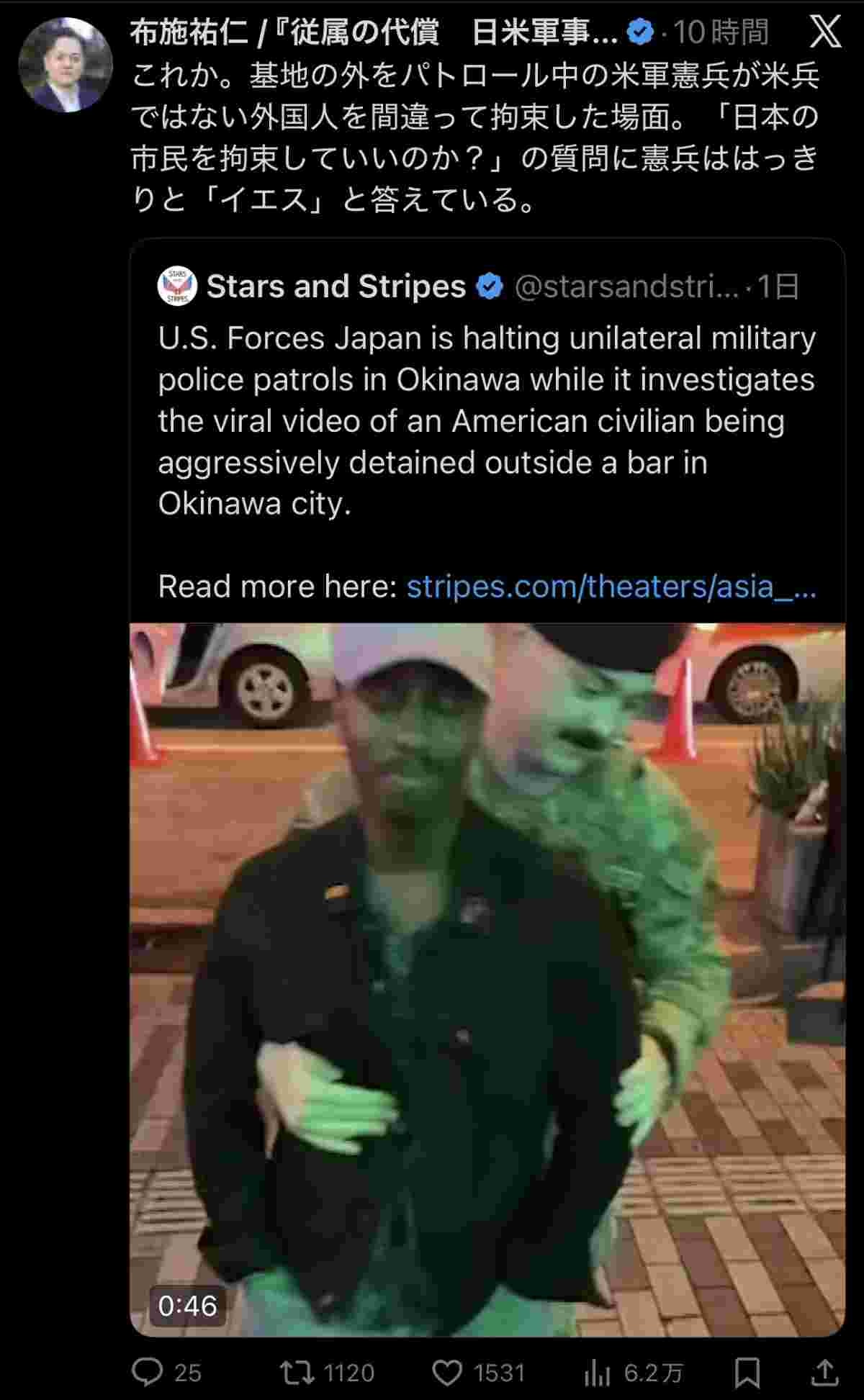 沖縄市街地パトロール中の米軍警察、一般人を拘束してしまい大炎上!日本人でも拘束するのかとの質問に「Yes」