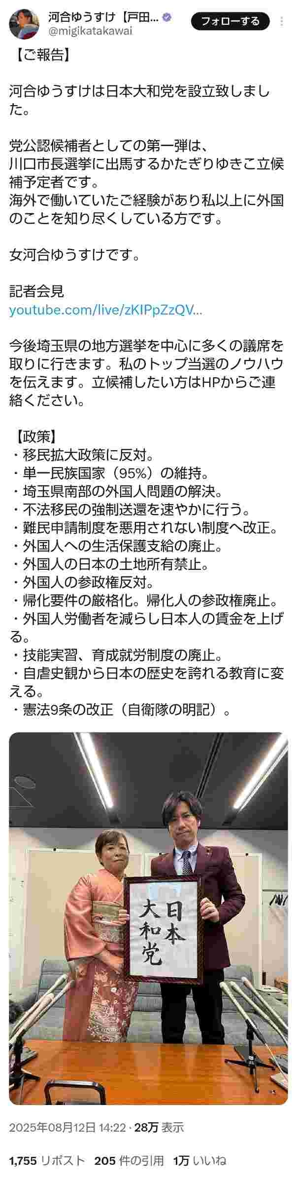 河合ゆうすけ義士、日本大和党(にちもとたいわとう)を設立
