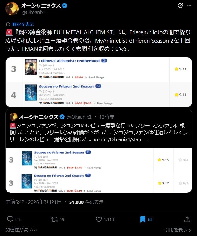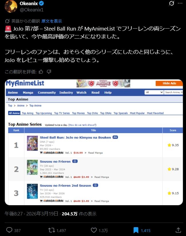 海外のフリーレン信者、MALでジョジョ7部に低評価爆撃をした結果反撃食らってスコアが下がってしまうwww