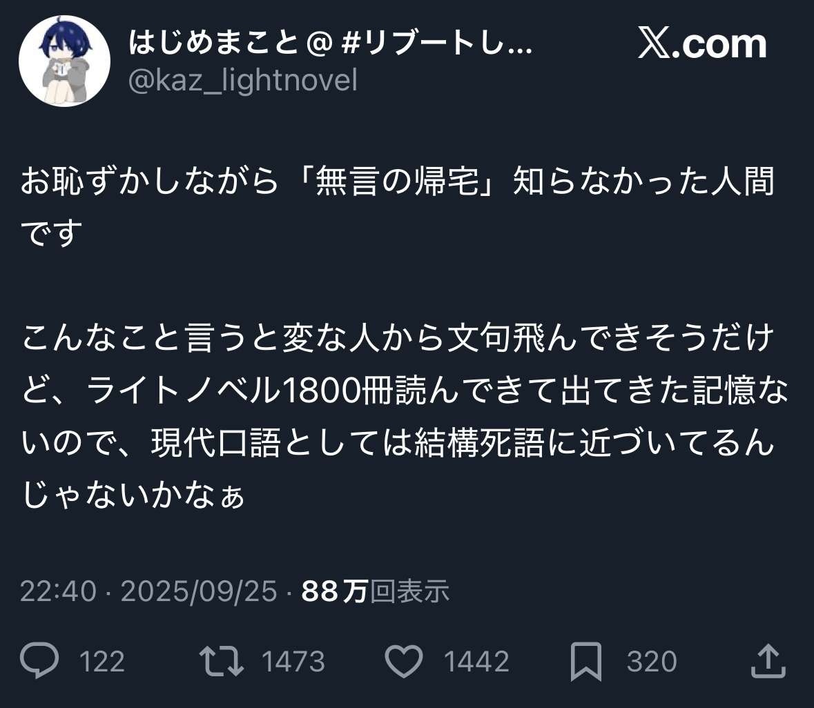 - ラノベで「無言の帰宅」って使う場面確かに思い浮かばんな