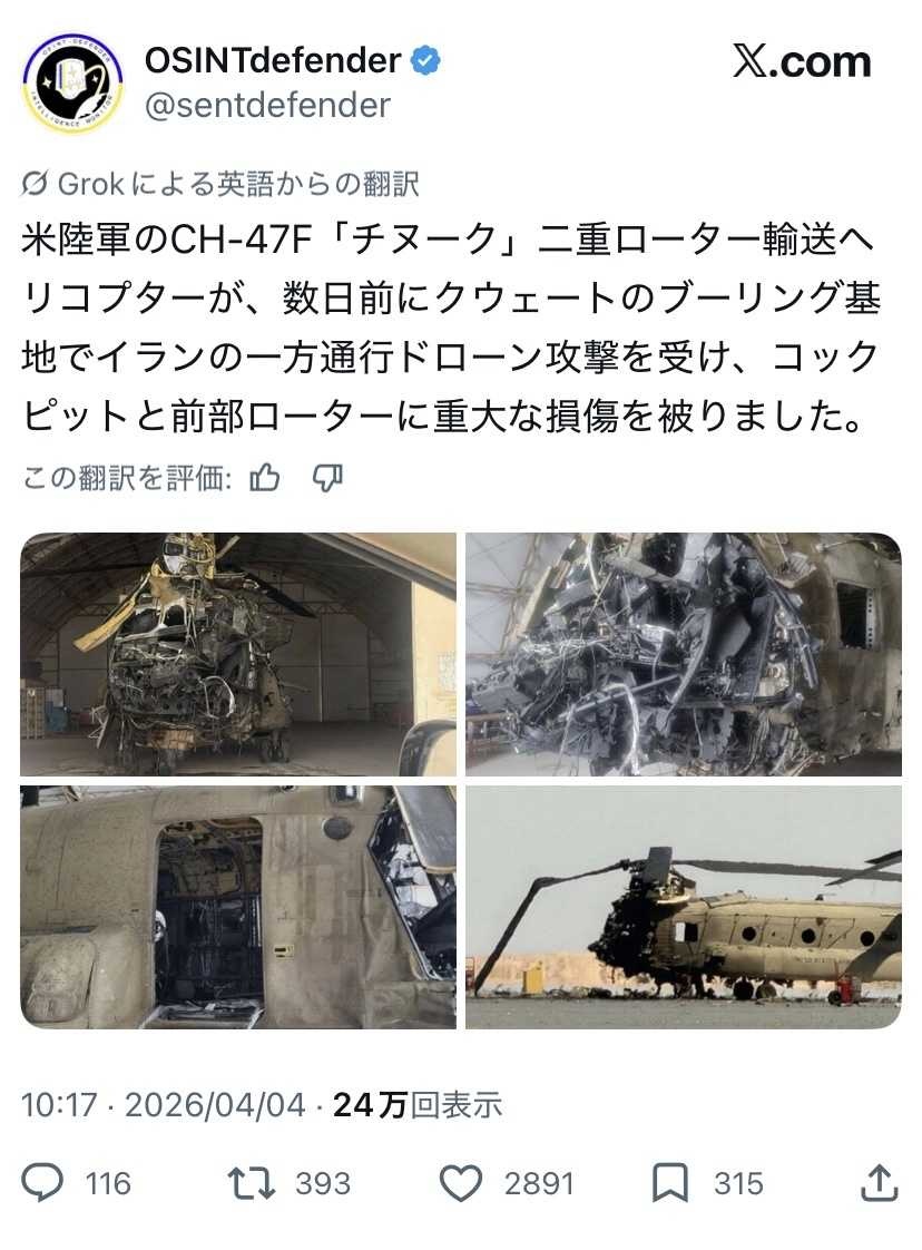 米空軍、今度はCH-47チヌークが破壊される🚁