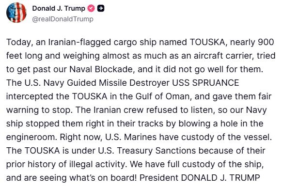 今日、イラン船籍の貨物船TOUSKA (長さ約 900フィート、空母に匹敵する重量)が、我々の海軍封鎖を突破しようと試みましたが、彼らにとっては良い結果になりませんでした。