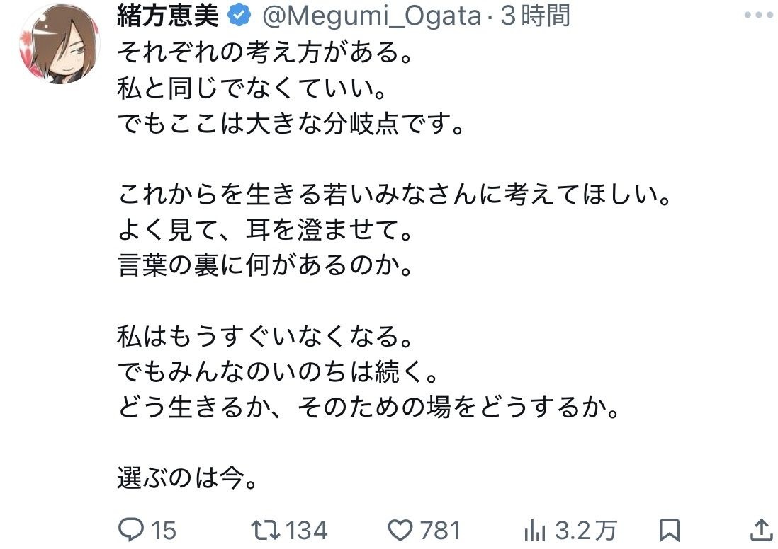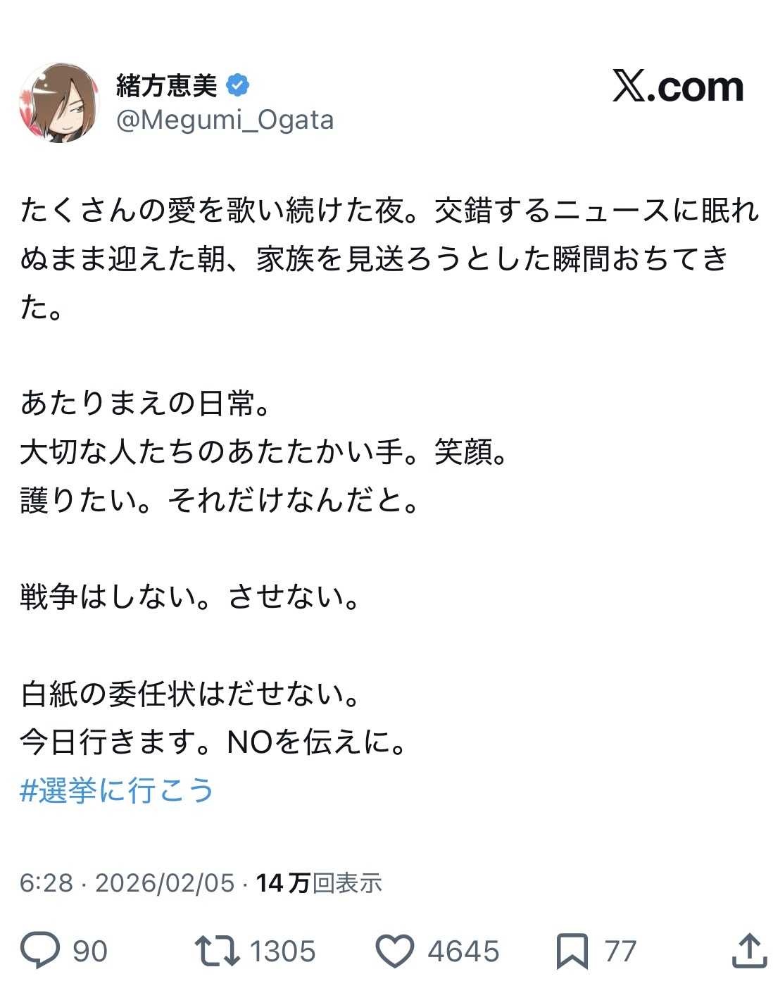 緒方恵美「戦争はしない。させない。白紙の委任状はだせない。今日行きます。NOを伝えに。#選挙に行こう」